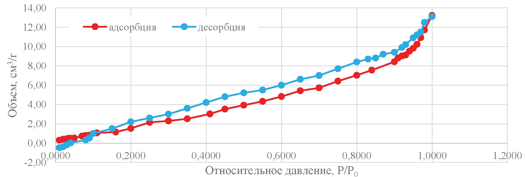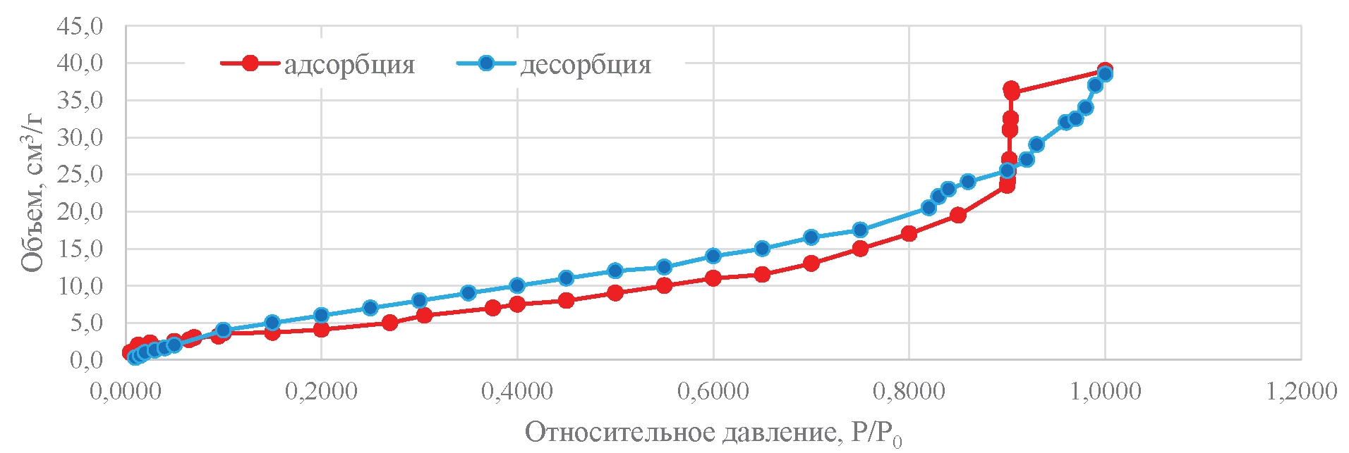 Изотермы адсорбции–десорбции, как и распределение пор по размерам показали, что данные угли относятся к III типу адсорбции с V подтипом, то есть являются мезопористыми со средним размером пор 40–45 нм.