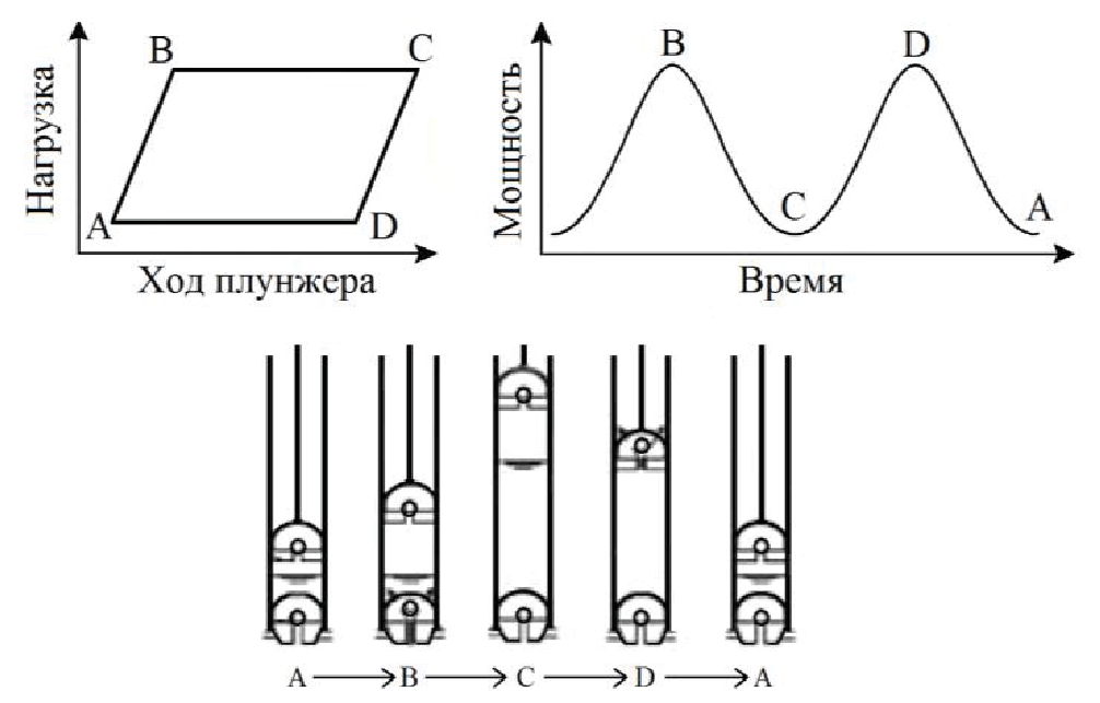 Всасывающий клапан и нагнетательный клапан насоса включаются в работу при возвратно-поступательном движении полированного штока. Хотя открытие обоих клапанов зависит и от количества свободного газа в насосе, в нормальном рабочем состоянии всасывающий клапан закрывается в конце хода вверх, а нагнетательный клапан закрывается в конце хода вниз. От состояния этих клапанов зависит давление насоса, определяющее нагрузку на плунжер. Когда нагнетательный клапан открыт, давление насоса почти равно давлению нагнетания, и на плунжер действует только выталкивающая сила. В то время как при открытом всасывающем клапане давление насоса практически равно давлению всасывания и на плунжер оказывается большая нагрузка. Неравномерная нагрузка на плунжер во время цикла приводит к неравномерной нагрузке редуктора. Поэтому в ШГНУ на кривошипе закреплен противовес для компенсации неравномерности нагрузок и уменьшения мощности двигателя.