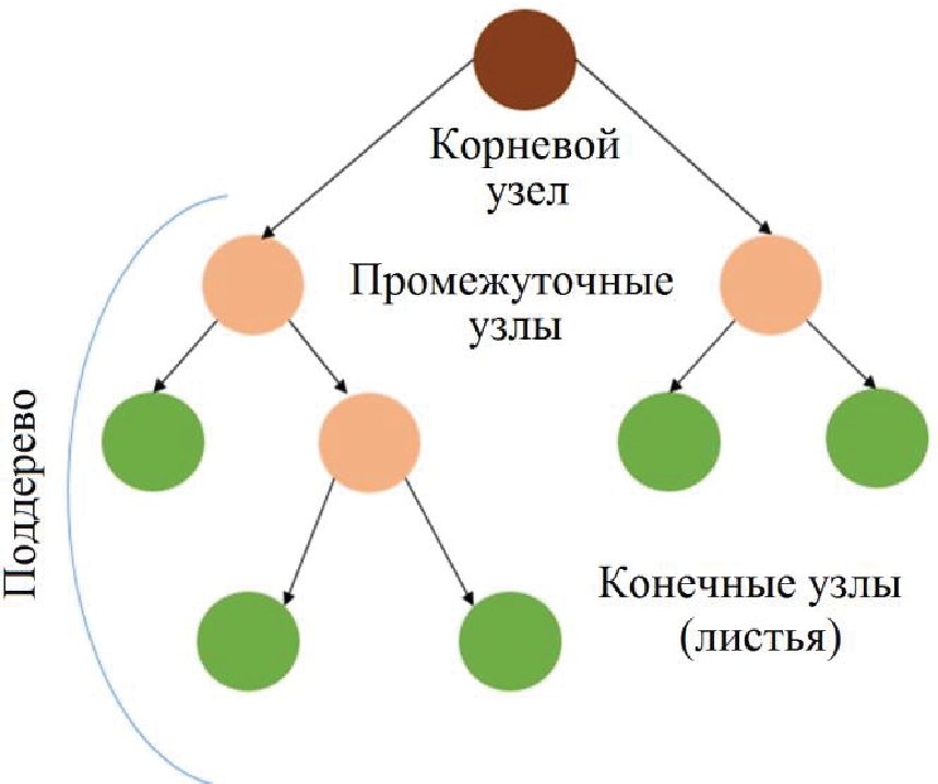 Дерево решений – это непараметрический метод обучения, который служит диагностическим инструментом, создающим систему, основанную на знаниях, посредством индуктивного вывода из историй прецедентов. Дерево начинается с корневого узла, разделяющегося на две ветви; дальнейшее разделение происходит на промежуточных узлах, также называемых узлами принятия решений. Завершается дерево конечными или листовыми узлами, и любое связанное подмножество узлов называется поддеревом (рис. 2).