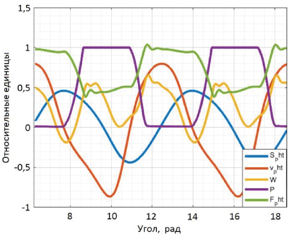 На рис. 11 показаны нормированные кривые смещения и скорости полированного штока, нагрузки на него, мощности двигателя и давления насоса. На кривой давления насоса легко различимы положения рабочих точек клапанов. Начало сжатия соответствует закрытию всасывающего клапана, а начало расширения соответствует закрытию нагнетательного клапана. Аналогично конец сжатия совпадает с открытием нагнетательного клапана, а конец расширения – с открытием всасывающего клапана. При сравнении кривой давления насоса с кривой мощности двигателя положения открытия, всасывающего и нагнетательного клапанов на кривой мощности двигателя совпадают с пиками, а положения закрытия клапанов соответствуют впадинам. Поэтому пики и провалы на кривой мощности двигателя имеют решающее значение для описания рабочего процесса. В рамках предложенного метода для каждого образца определяются векторы признаков, в таблице представлены средние значения компонентов этих векторов. Можно сделать вывод, что эти векторы признаков весьма отчетливо характеризуют каждое рабочее состояние.