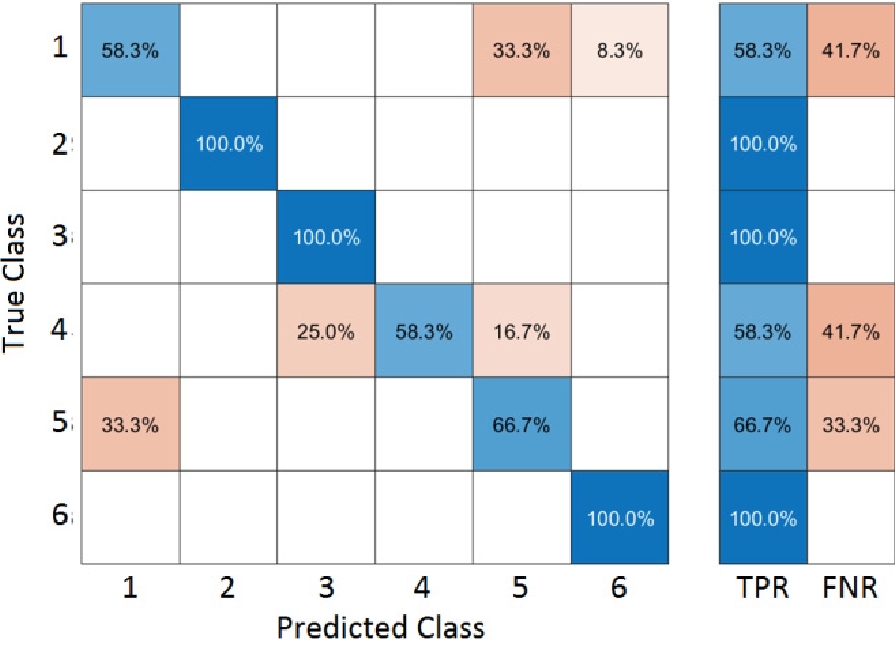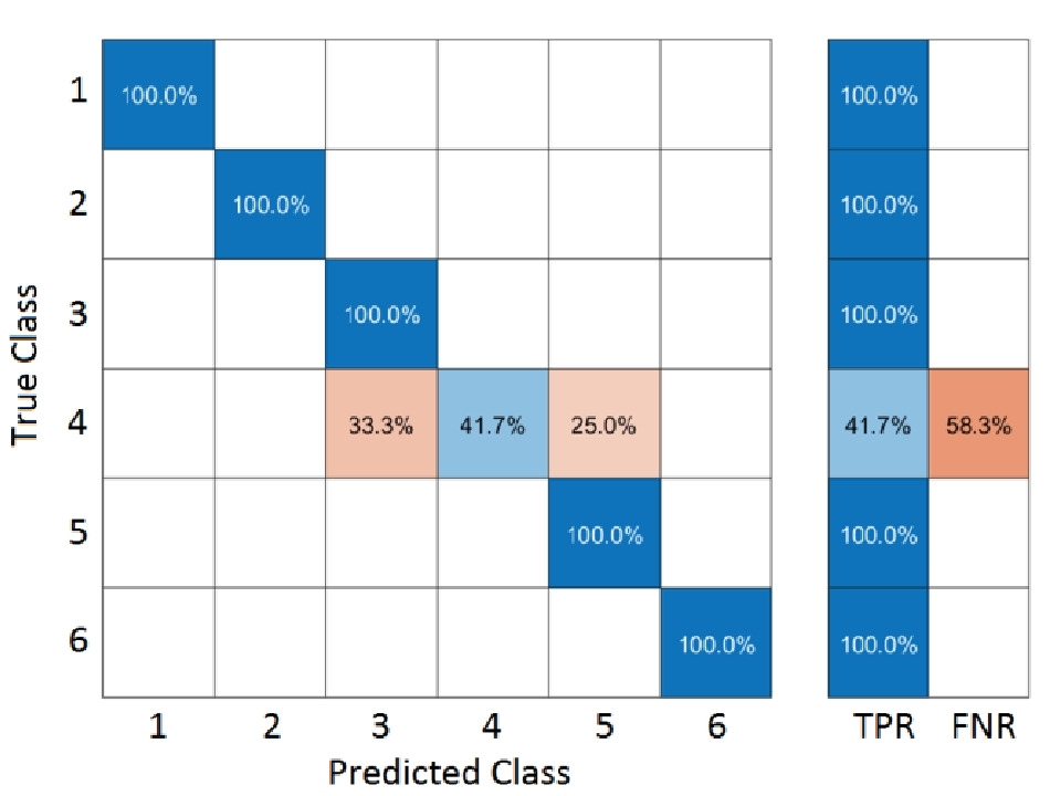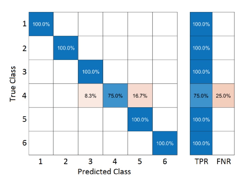 На рис. 13–16 представлены матрицы распознавания, показывающие результаты классификации, диагональные элементы в этих матрицах представляют собой точно предсказанные выборки. Здесь обозначено: True Class – истинный класс; Predicted Class – предсказанный класс; TPR – доля правильно классифицированных наблюдений на истинный класс; FNR – доля неправильно классифицированных наблюдений на истинный класс. Строки с первой по шестую соответствуют рабочим состояниям штангового насоса: нормальное, негерметичность нагнетательного клапана, эффект захвата газа, недостаточное поступление жидкости, плунжер достигает верхней мертвой точки и плунжер достигает нижней мертвой точки соответственно.