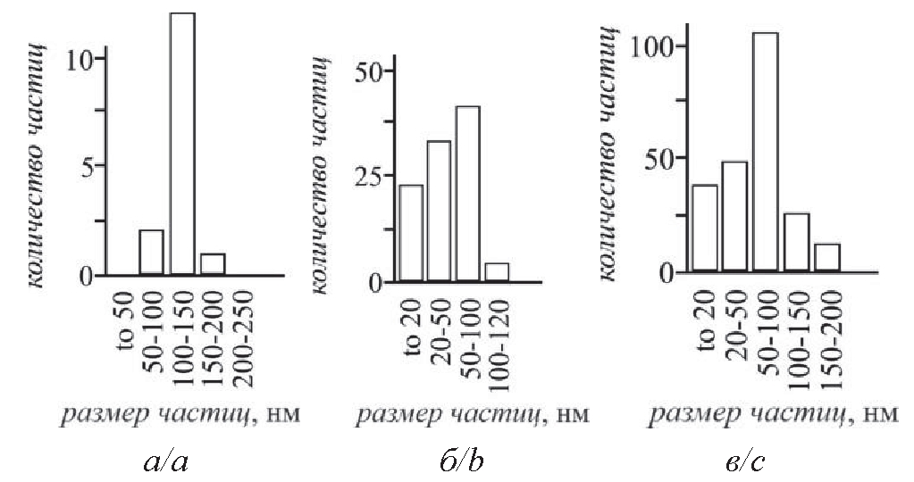 Рис. 3. Диаграммы распределения частиц по размерам: а) PdНЧ–БГ; б) PdНЧ–БГЦ; в) PdНЧ–Ц