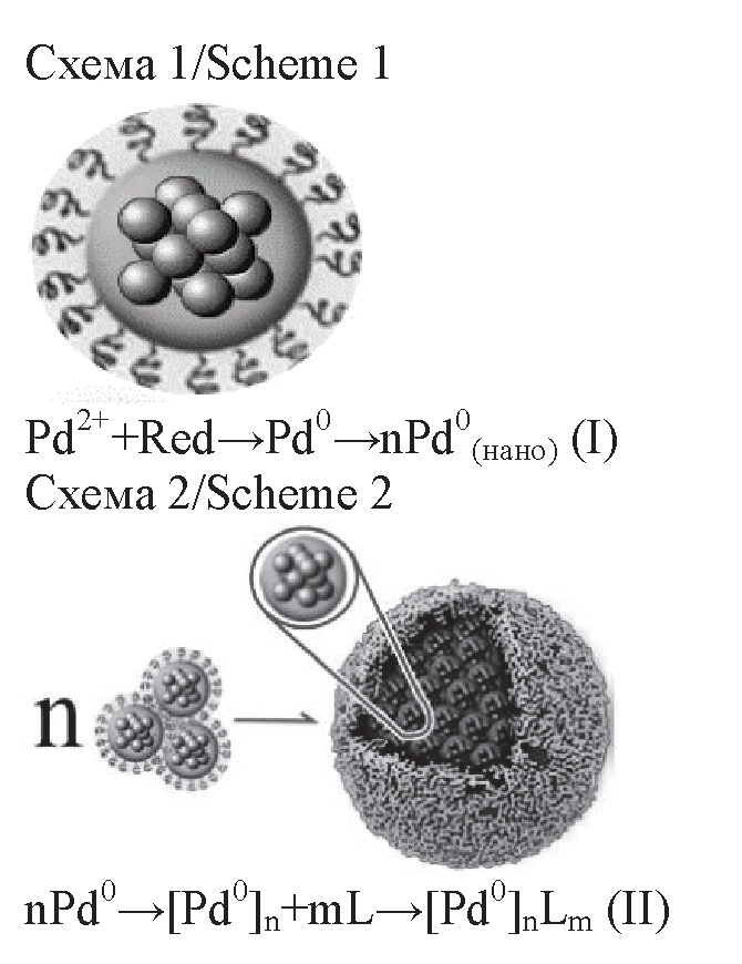 В колбу помещали 10 мл 1·10–4 М Н2[PdCl4]), добавляли 30 мл 10–4 М Na3C6H5O7 и 60 мл бидистиллированной воды, после чего по каплям (0,03 мл) добавляли 0,015 М NaBH4 до получения золя светло-коричневого цвета.