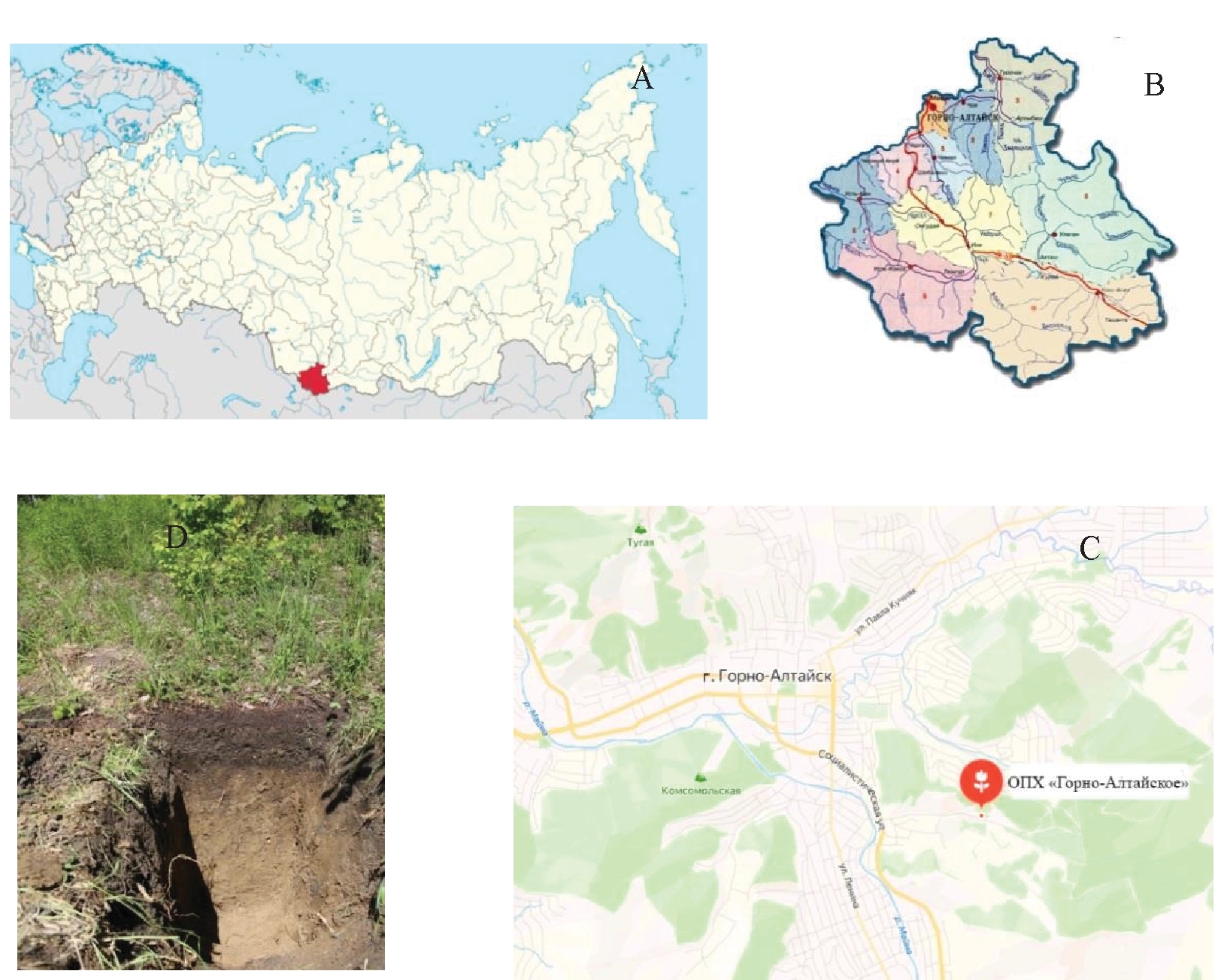 Рис. 1. Карта-схема расположения и фото объекта исследования: А) Республика Алтай на карте Российской Федерации; B) г. Горно-Алтайск на карте Республики Алтай; C) ОПХ «Горно-Алтайское» на карте г. Горно-Алтайска; D) фото разреза чернозема выщелоченного на участке ОПХ «Горно-Алтайское»
