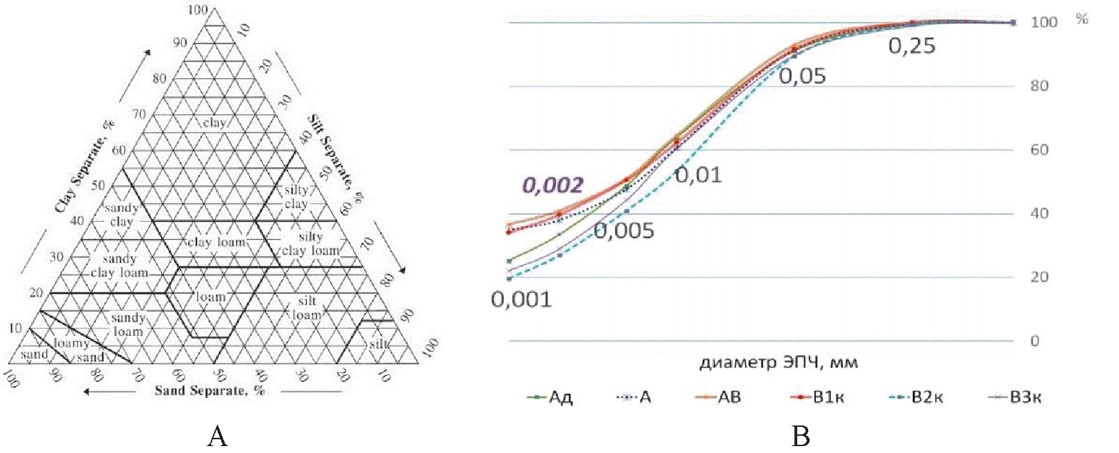 Fig. 3. Application of the graphic interpolation method to determine the certain sizes soil particles percentage within the international classification: А) soil texture triangle with the names of soil classes according to FAO classification; В) integral curves of the different sizes soil particles distribution in the horizons of the apple orchard leached agrochernozem of the Gorno-Altaiskoe experimental station