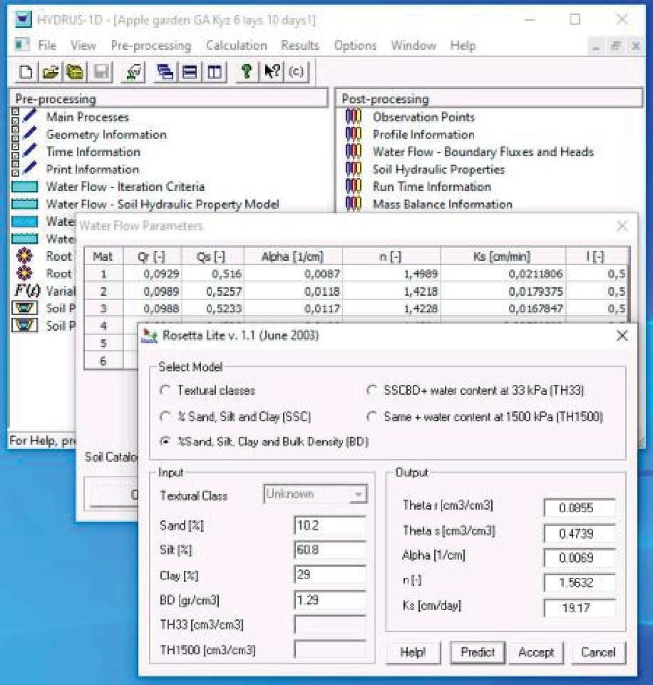 Рис. 4. Интерфейс программы Hydrus 1D, этап Pre-processing, вычисление параметров аппроксимации ОГХ функцией Ван-Генухтена и коэффициента фильтрации (Кф)