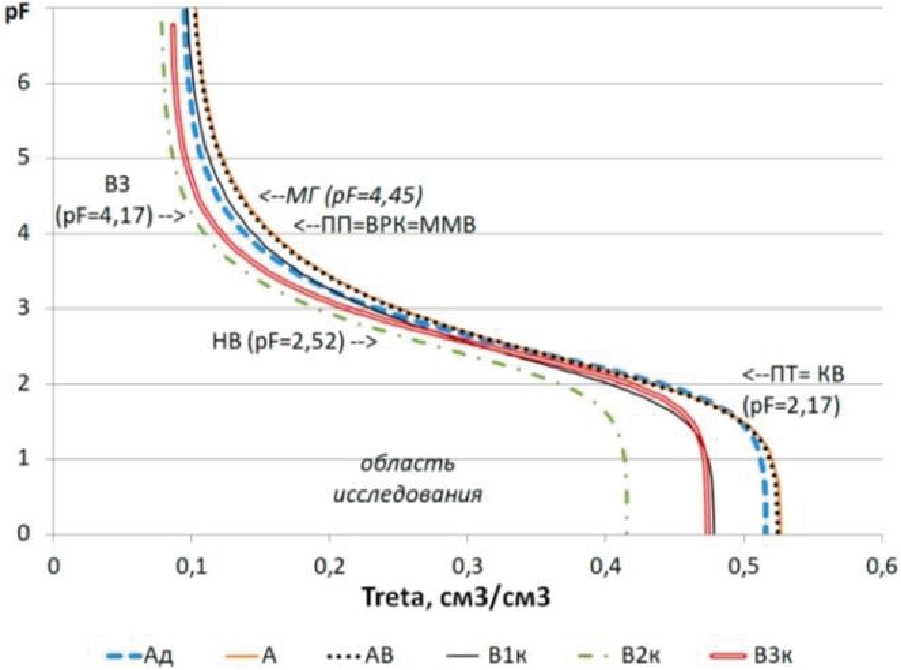 Отметим, что расчетные величины полной влагоемкости θs практически для всех горизонтов (кроме В2к) совпали со значениями полной влагоемкости как почвенно-гидрологической константы (характерная влажность почвы, определяемая по ее состоянию или по состоянию контактирующих с ней объектов) по энергетической концепции Воронина [2], когда ε=>pF=0, где ε – пористость почв (табл. 1).