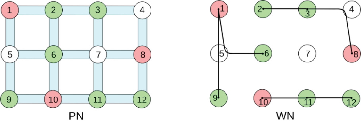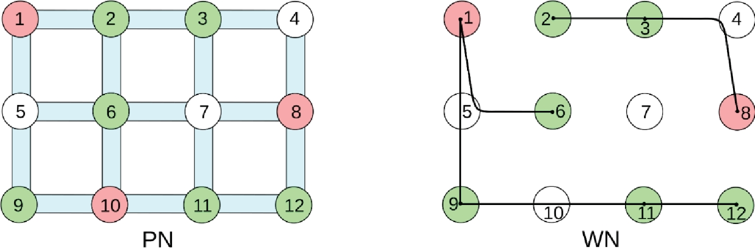 На рис. 1 представлен пример первичной сети 𝑃𝑁 (графа выработок) в виде решетки и вторичной сети WN (графа линий связи в шахте) для описания топологий шахты и коммуникаций в ней. Зелёным цветом отмечены БС, красным – КП.