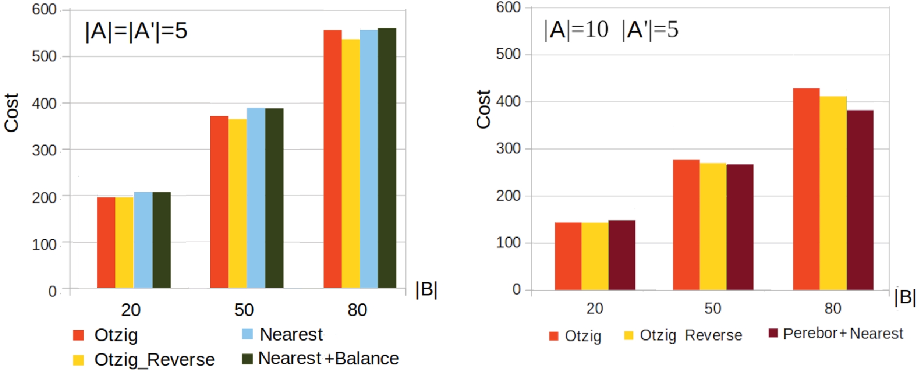 На рис. 4, a показан случай, когда |𝐴|=|𝐴′|=5. Видно, что для небольших значений |𝐵| лучший результат дает алгоритм 𝑂𝑡𝑧𝑖𝑔𝑅𝑒𝑣𝑒𝑟𝑠𝑒. Для больших значений |𝐵| лучший результат дает алгоритм 𝑁𝑒𝑎𝑟𝑒𝑠𝑡.