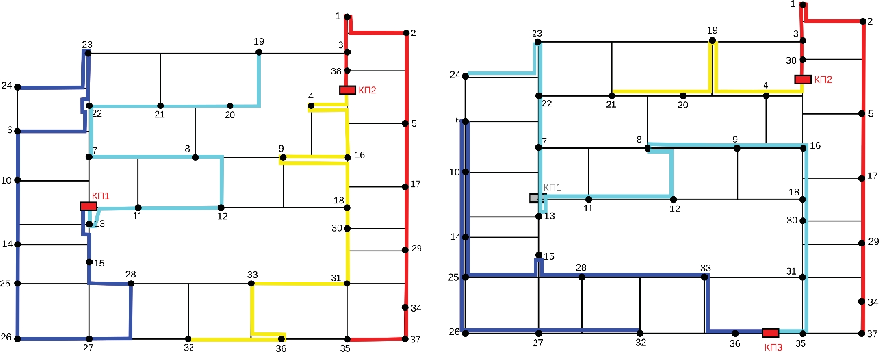 Рис. 6. Лучшие из найденных маршрутов прокладки кабелей при разных условиях: 2 КП, 𝐾𝐵=10 (слева) и 2 КП в 3 возможных АОШ, 𝐾𝐵=15 (справа)