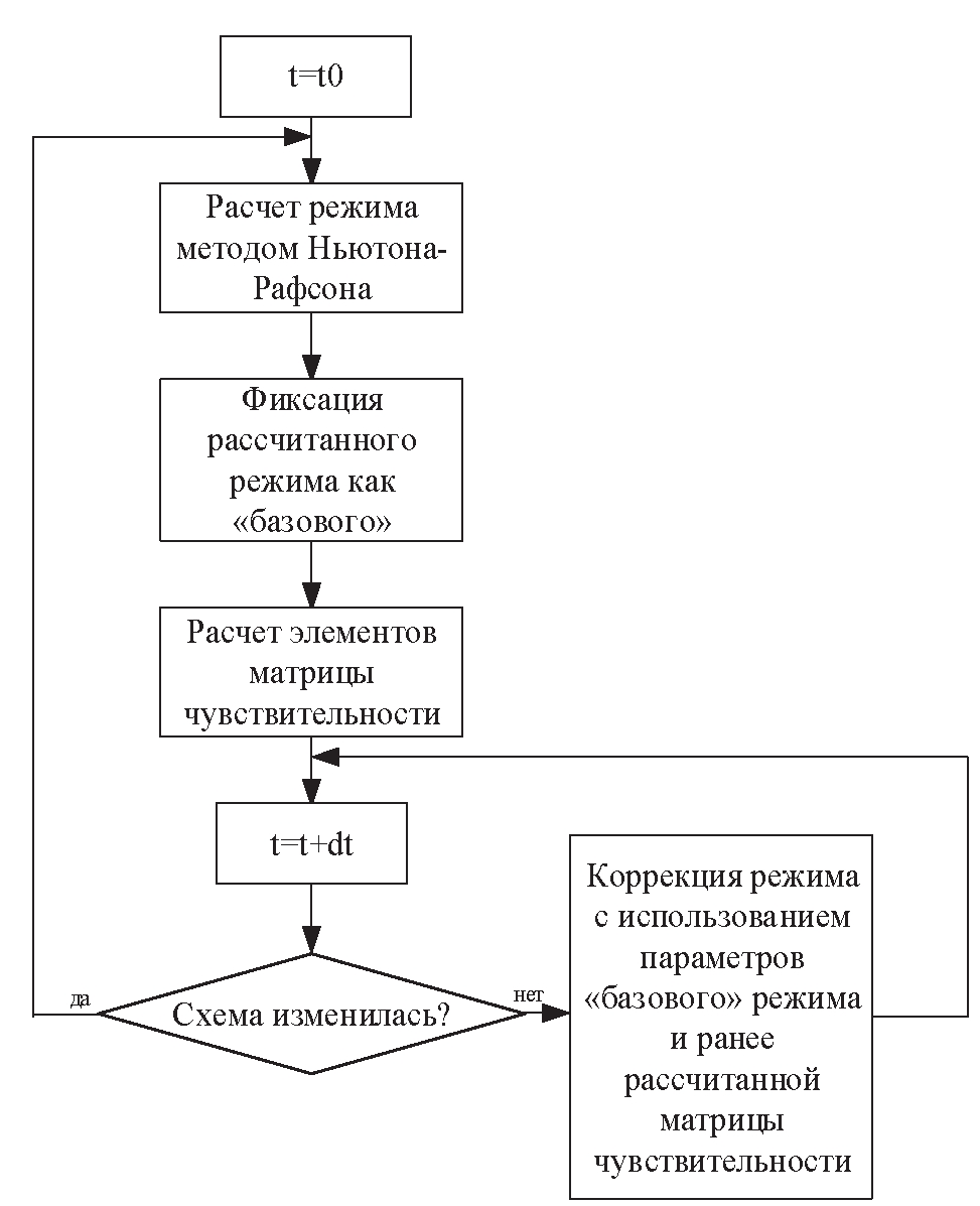 Описанный алгоритм позволяет вместо многократного итерационного процесса решения системы нелинейных уравнений производить умножение заранее известной матрицы чувствительности на вектор приращений мощностей нагрузок и прибавление результата к заранее известному вектору параметров «базового» режима. Блок-схема алгоритма определения параметров режима работы распределительной электрической сети показана на рис. 1.