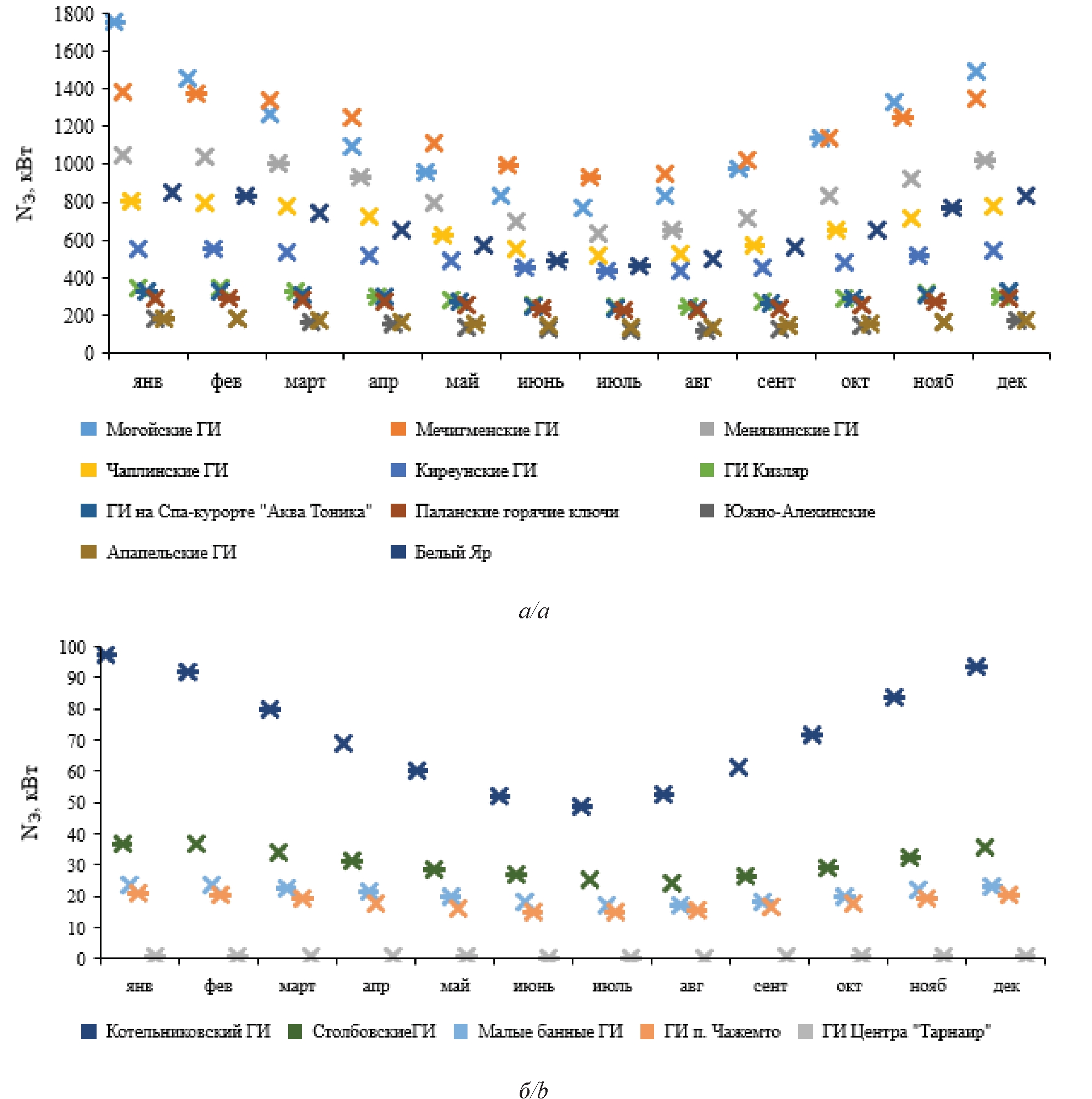 Расчетными исследованиями выявлено, что наибольшей электрической мощности модульные ГеоЭС достигают в январе для всех регионов России, так как этот месяц является наиболее холодным в году. Наименьшая генерируемая мощность ГеоЭС для большинства регионов России соответствует июлю, а для Камчатского края и Сахалинской области – августу, так как именно этот месяц является наиболее теплым.