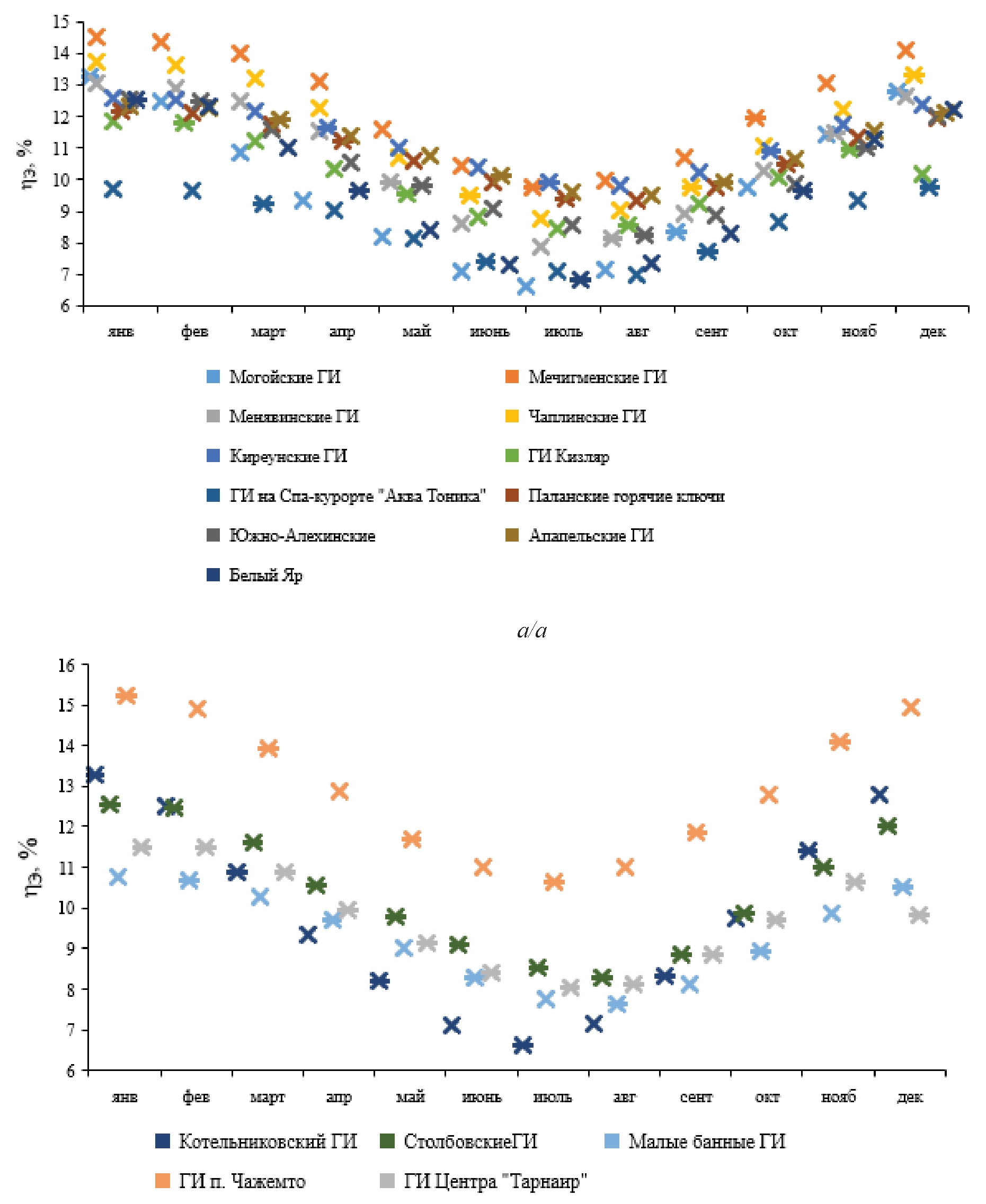Для ГеоЭС, работающей на Мечигменском ГИ, относительная разница абсолютного электрического КПД от самого холодного до самого теплого месяца в году составляет dηЭ=32,8 %. При этом бинарная станция обладает высокой электрической мощностью NЭ=930–1385 кВт, высоким абсолютным электрическим КПД ηЭ=9,74–14,51 %. На втором месте по эффективности и стабильности выработки ЭЭ в течение календарного года стоит ГеоЭС на Менявском ГИ, для нее NЭ=634–1053 кВт, ηЭ=7,86–13,06 %.