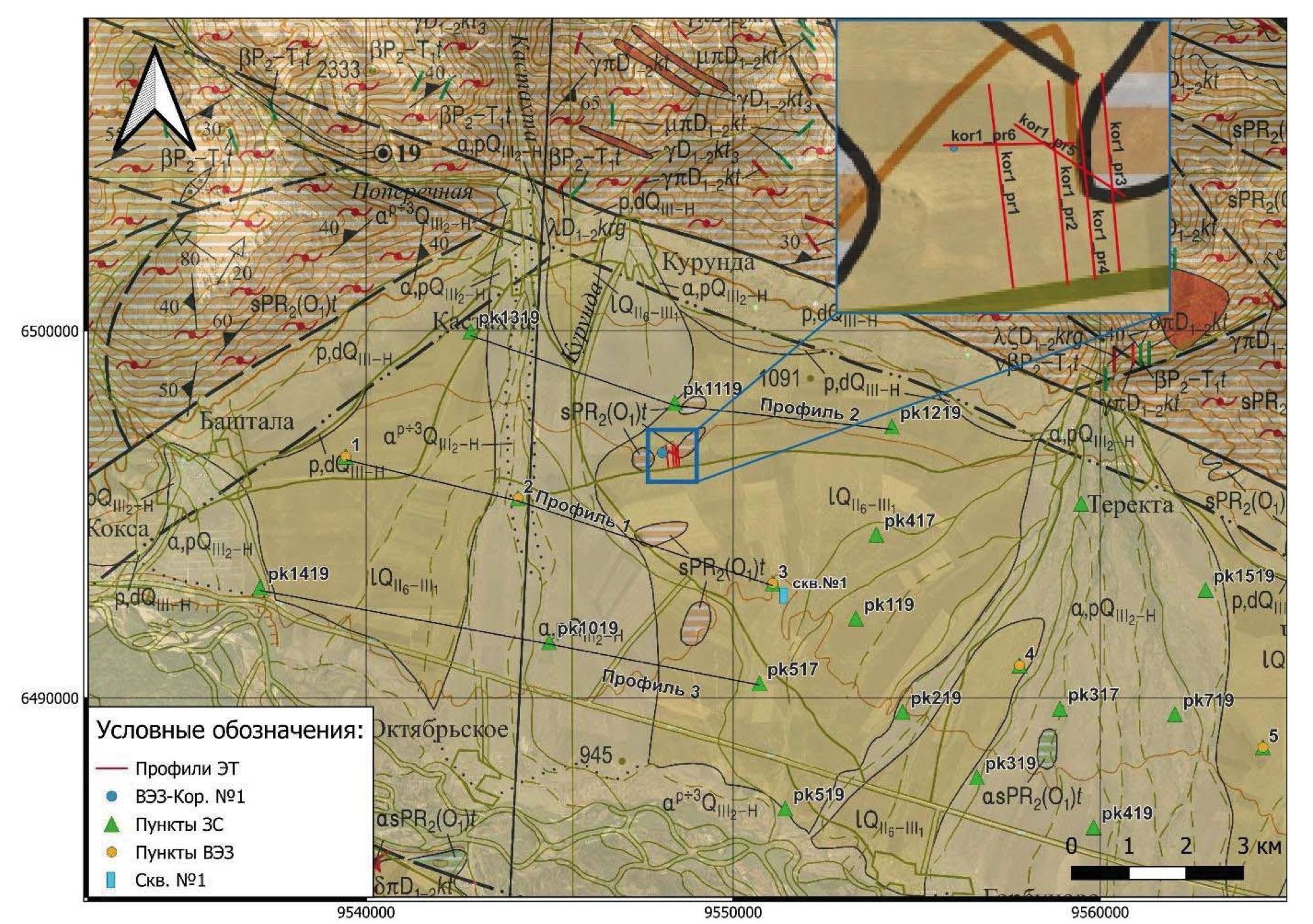Первые модели строения участков с выходами коренников в западной части впадины представлены в работе [7] на основе интерпретации данных ЭТ с использованием двух-, трехмерной инверсии данных. В рамках данного исследования с целью верификации и уточнения строения таких участков будет представлена геоэлектрическая модель по данным ЭТ, обоснованная трехмерным численным моделированием, и варианты её согласования с глубинными геоэлектрическими моделями. На схеме фактического материала показаны измерения методами электроразведки в Уймонской впадине, включающие системы профилей ЭТ на участках выходов пород фундамента и ближайшие к ним пункты ЗСБ (рис. 1). Схема построена с использованием информационной системы QGIS. Полевые данные и результаты интерпретации ЗСБ будут привлечены для обоснования моделей ЭТ и общего геоэлектрического строения участков исследования.