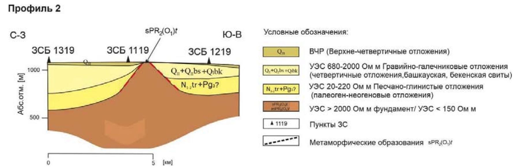 Сопоставление разрезов по профилям ЗСБ 1 и ВЭЗ 1 демонстрирует принципиальное совпадение интерпретации двух разных методов электроразведки на постоянном и переменном токе. Вместе с тем нельзя не учитывать неоднозначность решения обратной задачи, практически всегда существуют эквивалентные решения в рамках выбранной погрешности подбора. Для того чтобы подтвердить одну из версий, являются ли выходы коренников локальными приповерхностными неоднородностями или это выходы на дневную поверхность непосредственно кровли складки фундамента, была выполнена дополнительная интерпретация данных ЗСБ по профилю 2.
