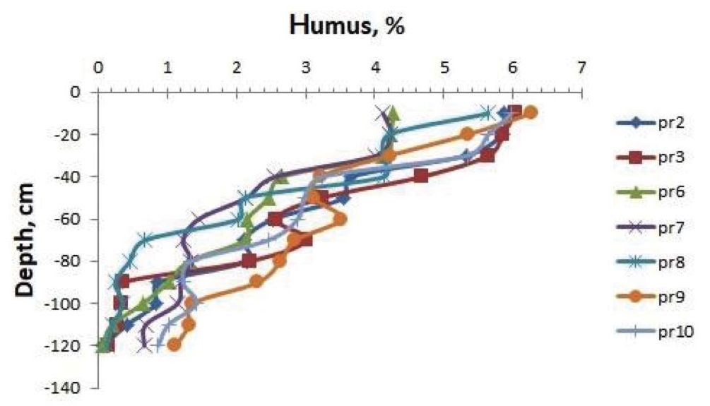 Рис. 3. Распределение гумуса в профилях 2, 3, 6–10
