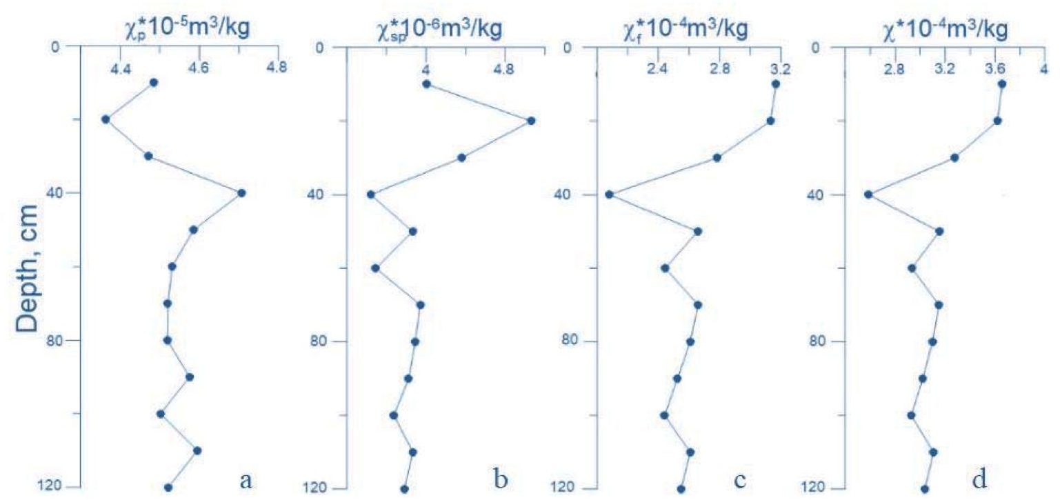 Fig. 5. Contribution of paramagnetic (а), superparamagnetic (b) and ferromagnetic components (c) to magnetic susceptibility (d) (profile 1)