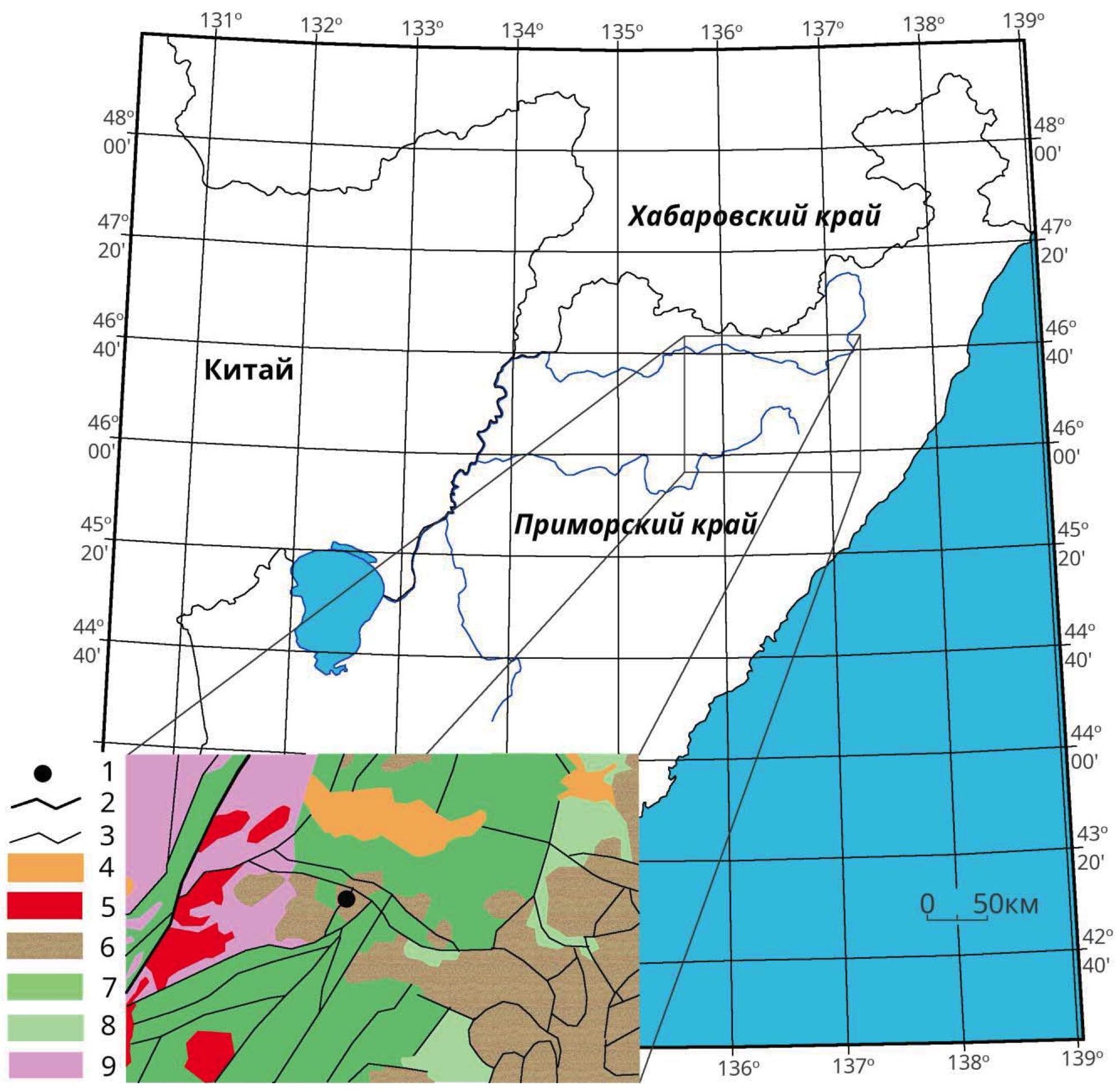 Fig. 1. Regional position of the deposit. Tectonic scheme of the region within a radius of about 150 km from the Verkhnee-Zolotoe deposit, scale 1:2500000: fragment [2, 7]. Symbols: 1 – Zvezdny ore node; faults: 2 – regional, 3 – large; 4 – Cenozoic sand-siltstone coal-bearing, molasse and platobasalt structural-material complexes; 5 – granite and granodiorite-granite structural-material complexes of Early Cretaceous age; 6 – Late Cretaceous, Paleogene and Neogene volcanogenic and intrusive structural-material complexes of the East Sikhote-Alin marginal continental volcanic belt; geodynamic complexes of mature island arcs: 7 – Berriasian-Valanginian and Goteriv-Albian sand-siltstone structural-material complexes of the back arc basin; 8 – Apt-Albian volcanogenic, volcanic-terrigenous and flyschoid structural-material complexes of the island arc; 9 – olistostromic and siltstone-sandstone structural-material complexes of Jurassic age