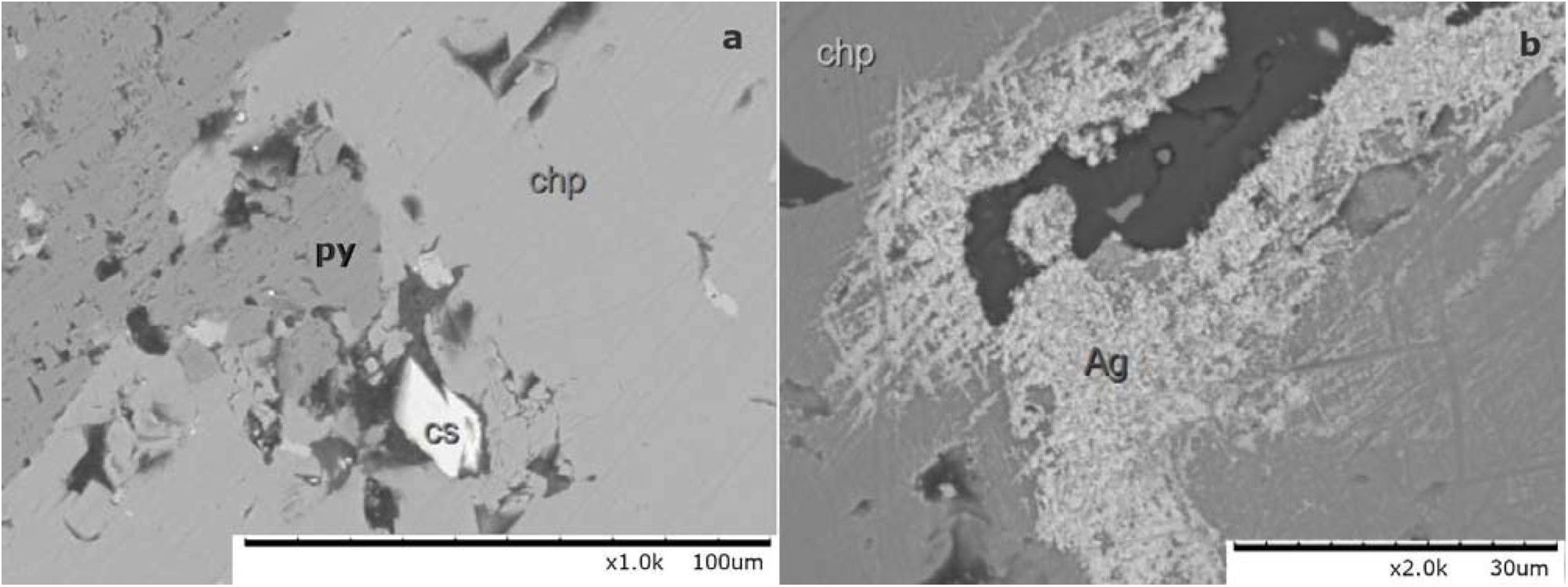 Рис. 3. a) идиоморфный касситерит (cs) в ксеноморфном халькопирите (chp), образующем тесное срастание с ксеноморфными пиритом (py); b) дендриты серебра (Ag) в ксеноморфном халькопирите (chp)