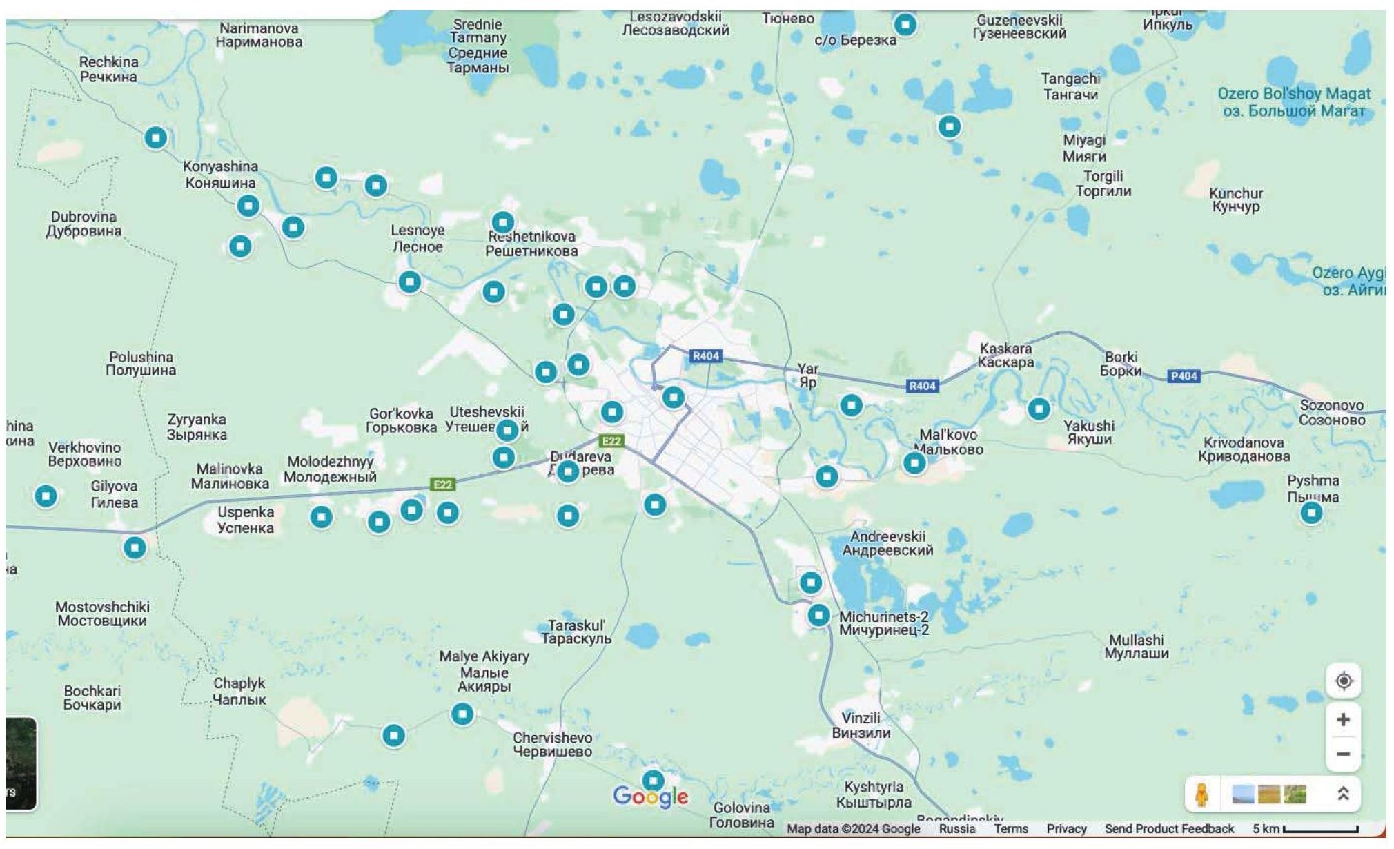 Fig. 1. Sample collection map, Tyumen urban agglomeration, N=132 samples. Settlements: Antipino, Bereznyakovsky, "Verkhniy Bor" No. 1 Facility, Gorkovka, Derbyshi, Druganovo, Embaevo, Kamenka, Knyazhevo, Kuliga, Kuliga Zelyonye Kholmy, Kulakova, Lugovoe, Motushi, Metelevo, Novotormansky, Onokhino, Paderina, Patrushevo, Patrushevo Sosnovaya street, Perevalovo, Reshetnikovo, Rechkina, Rechkino, Subbotina, Sukhodolye, Tyumen, Trufanovo, Ushakova, Ust-Pyshma, Funtova, Cherepanovo, Chernyaya Rechka, Chikcha, Yantyk, Zubarevo, Zubareva, Zonovo, Vinzili