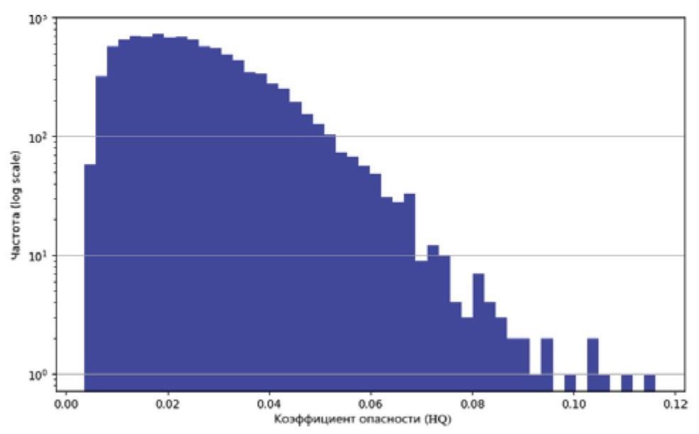 Для оценки возможного диапазона значений HQ, который характеризует риск для здоровья человека при воздействии химических веществ, использовалась симуляция Монте-Карло. Этот метод позволил смоделировать неопределенность и вариации ключевых параметров и оценить возможные риски в условиях неопределенности. Неканцерогенный риск оценивался как вероятность того, что воздействие загрязнителя превысит безопасный уровень.