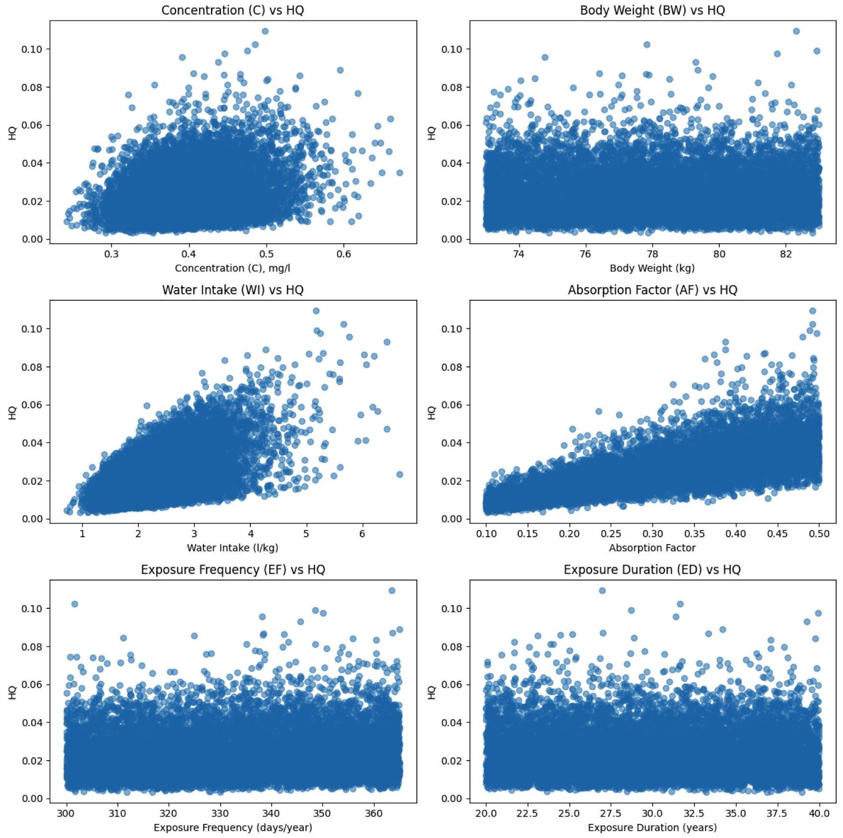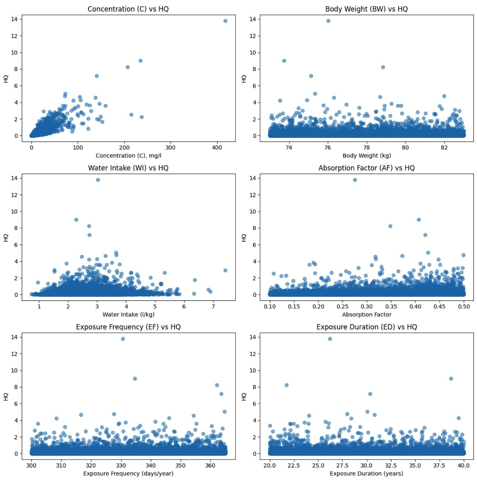 На основе значений CDI для каждой итерации вычисляется HQ, который представляет собой отношение получаемой дозы загрязнителя к допустимой дозе (RfD). HQ>1 указывает на превышение безопасного уровня воздействия, что свидетельствует о потенциальной опасности для здоровья.