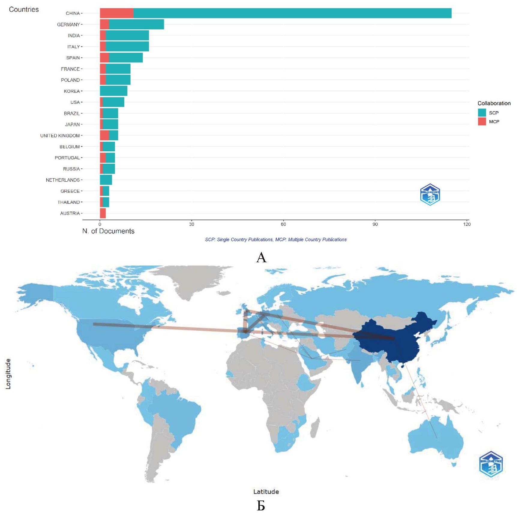Рис. 2. Наиболее продуктивные страны по количеству публикаций, выпущенных самостоятельно (SCP) или в сотрудничестве (MCP) (А); сеть сотрудничества между странами (линии показывают сотрудничество, толщина указывает на количество статей) (Б)