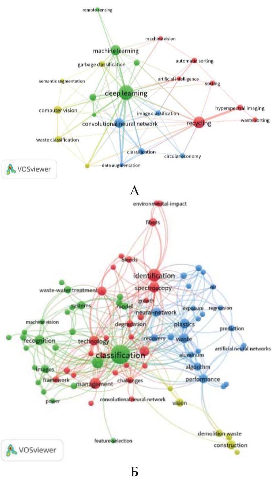 Сетевой анализ с использованием ключевых слов plus выявил четыре кластера (рис. 3, Б). Основной красный (28 терминов) и зеленый (25 терминов) кластеры отражают направленность исследований на модели автоматической классификации мусора. Синий (23 термина) и желтый (6 терминов) кластеры связаны с управлением отходами в целом: «отходы», «пластик», «алюминий». Среди других часто встречающихся терминов были «классификация», «идентификация» и «спектроскопия».