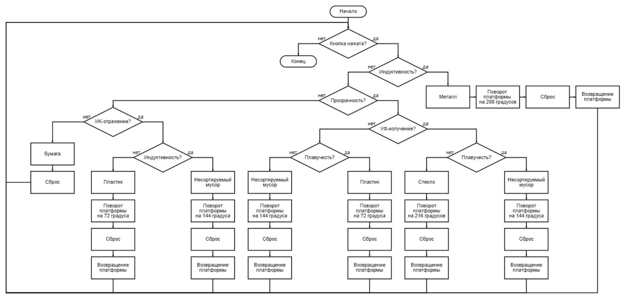 Процесс автоматической сортировки начинается с момента, когда мусор попадает в специальный бак и вызывает срабатывание кнопки. После этого запускается этап распознавания при помощи датчиков Arduino. Датчики собирают информацию о типе мусора и передают ее на микроконтроллер Arduino [18].