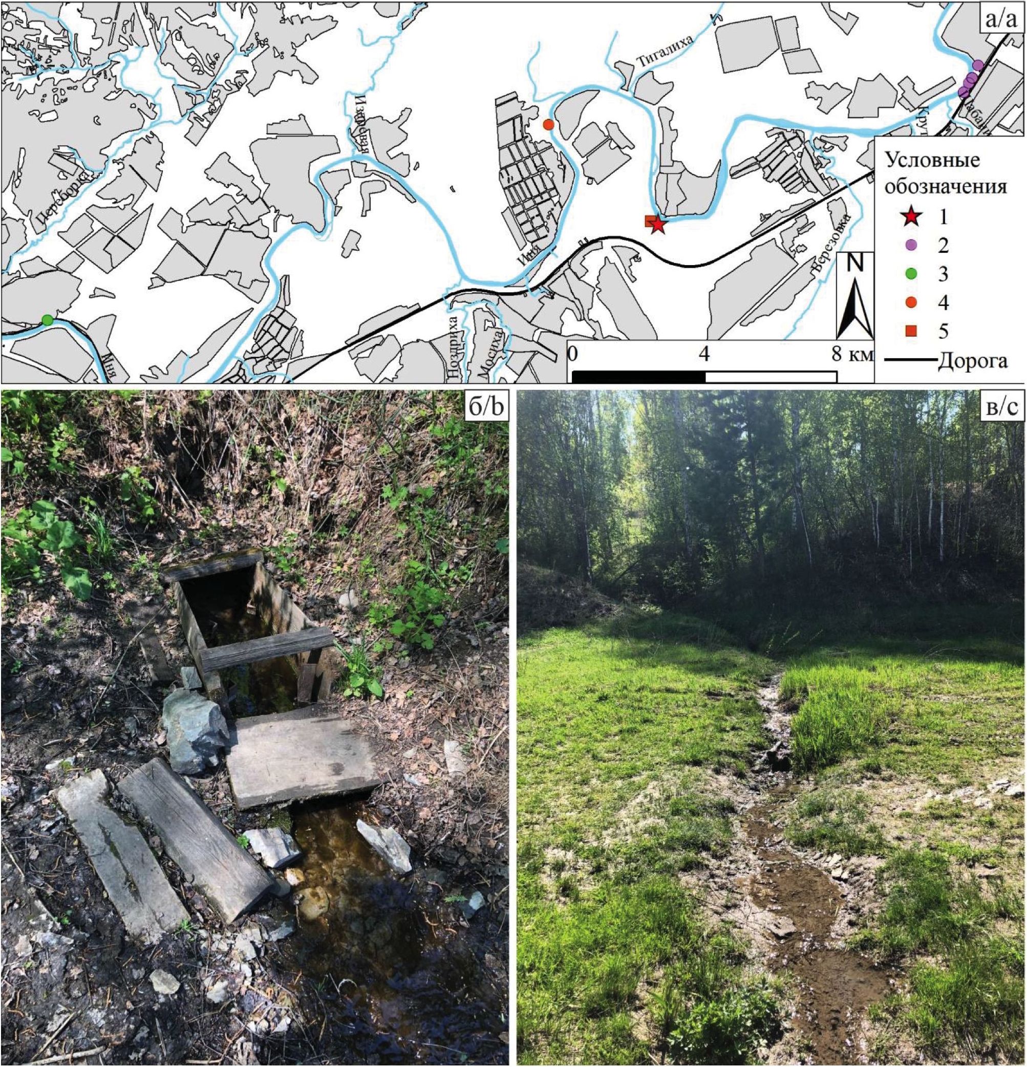 Fig. 1. Sampling location (a), photographs of the Zheleznodorozhny spring (b, c). Legend: 1 – Zheleznodorozhny spring; 2 – Inskie springs; 3 – Novolugovoy spring; 4 – Kapustny spring; 5 – rocks of the Yurginskaya formation
