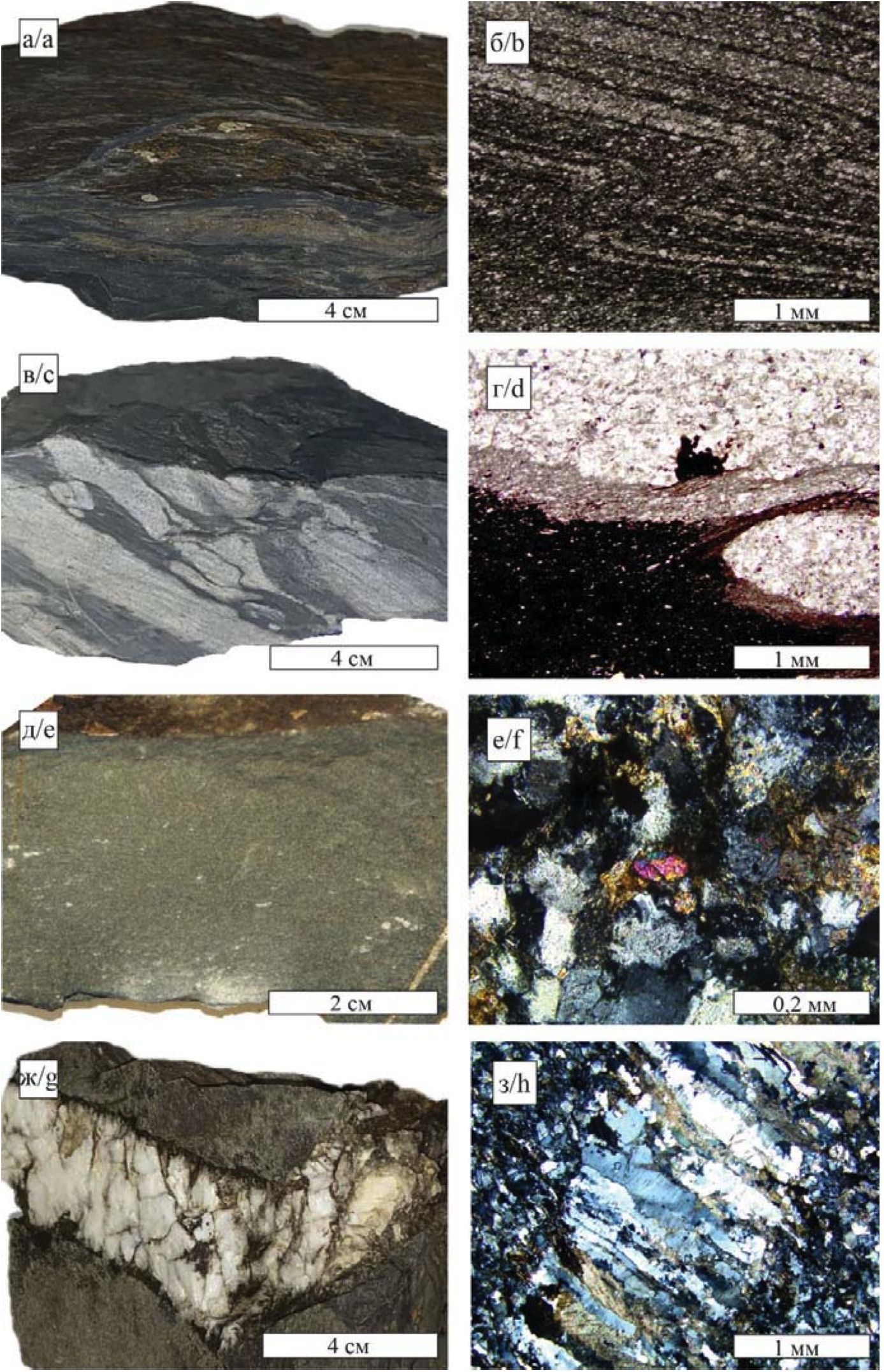 Рис. 2. Фотографии образцов и шлифов водовмещающих пород обн. 601: а, б) алеврито-глинистый сланец; в, г) переслаивание глинистого сланца и крупно-мелкозернистого алевролита; д) мелкозернистый песчаник с акцессорным цирконом (е); ж) прожилок кварца с примесью кальцита и оксидов-гидроксидов Fe; з) трещина, выполненная кварцем и кальцитом, в крупнозернистом алевролите
