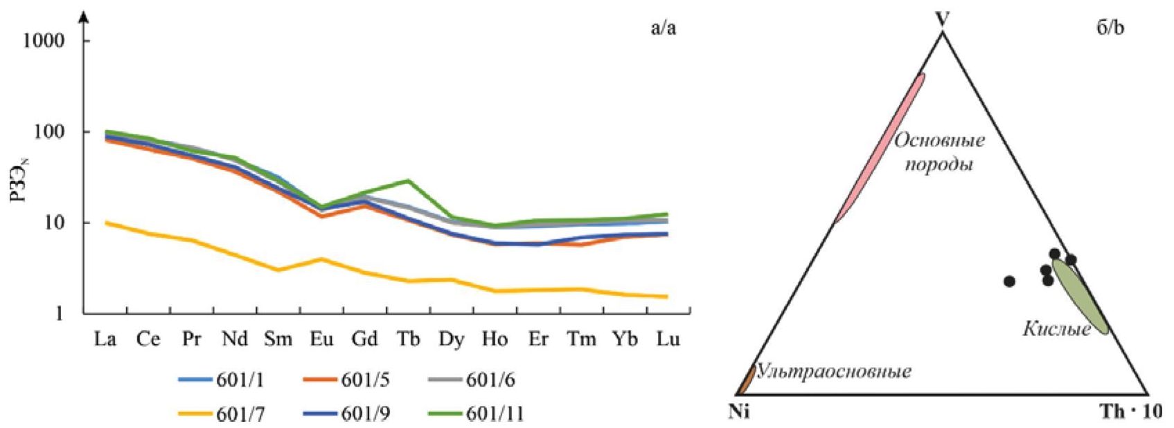 Сумма РЗЭ в изученных пробах варьирует от 131,5 до 178,14 г/т. Спектры РЗЭ, нормированные относительно постархейского австралийского сланца (PAAS), характеризуются слабо дифференцированными, практически горизонтальными кривыми, свидетельствующими об отсутствии каких-то заметных изменений состава РЗЭ относительно рассматриваемого эталона (рис. 3, а). Исключение составляет образец с повышенным содержанием Tb (601-11).