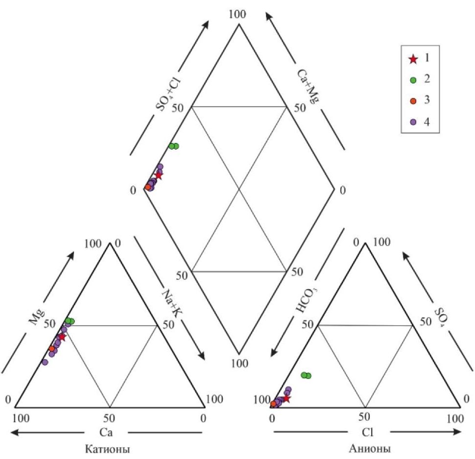 Рис. 4. Piper diagram of the chemical composition of the natural waters of the Inya River valley. Legend: 1 – Zheleznodorozhny spring; 2 – Novolugovoy spring; 3 – Kapustny spring; 4 – Inskie springs