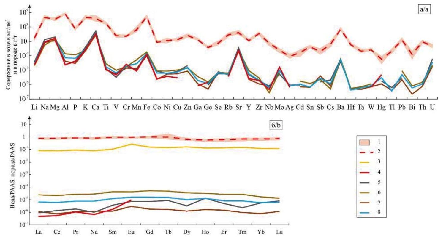 Рис. 5. Спектры распределение микрокомпонентов (а) и РЗЭ (б) в водах и вмещающих породах. Условные обозначения: 1 – глинистые сланцы; 2 – среднее по глинистым сланцам; 3 – кварцевая жила; 4 – Железнодорожный ключ; 5 – родник Новолуговой; 6 – родник Капустный; 7 – Инские источники; 8 – среднее для родников