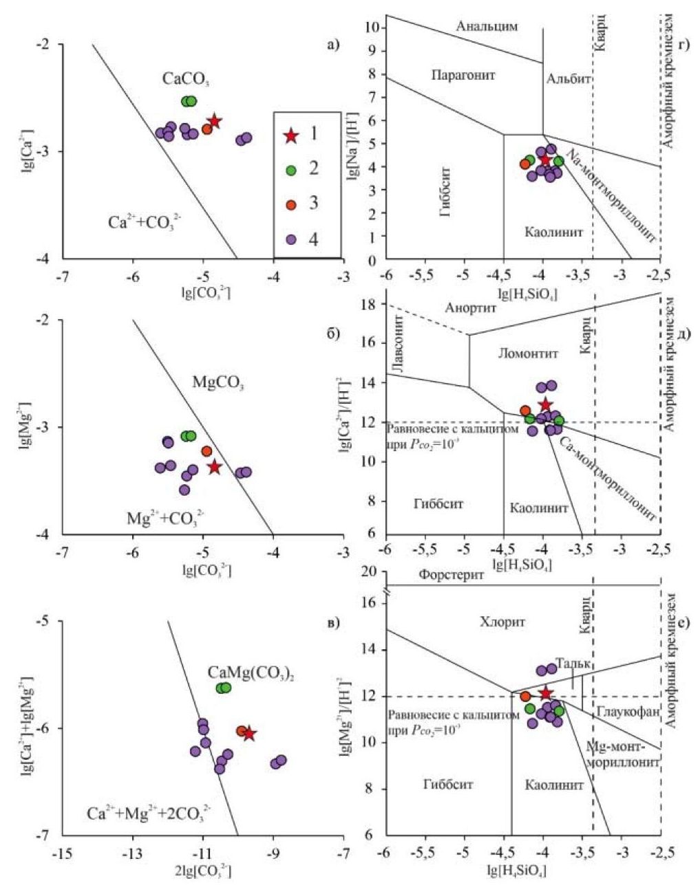 Fig. 6. Diagrams of stability of carbonate (а–в) and aluminosilicate (г–е) minerals under standard conditions with plotting the composition points of natural waters of the Inya River valley. Legend: 1 – Zheleznodorozhny spring; 2 – Novolugovoy spring; 3 – Kapustny spring; 4 – Inskie springs