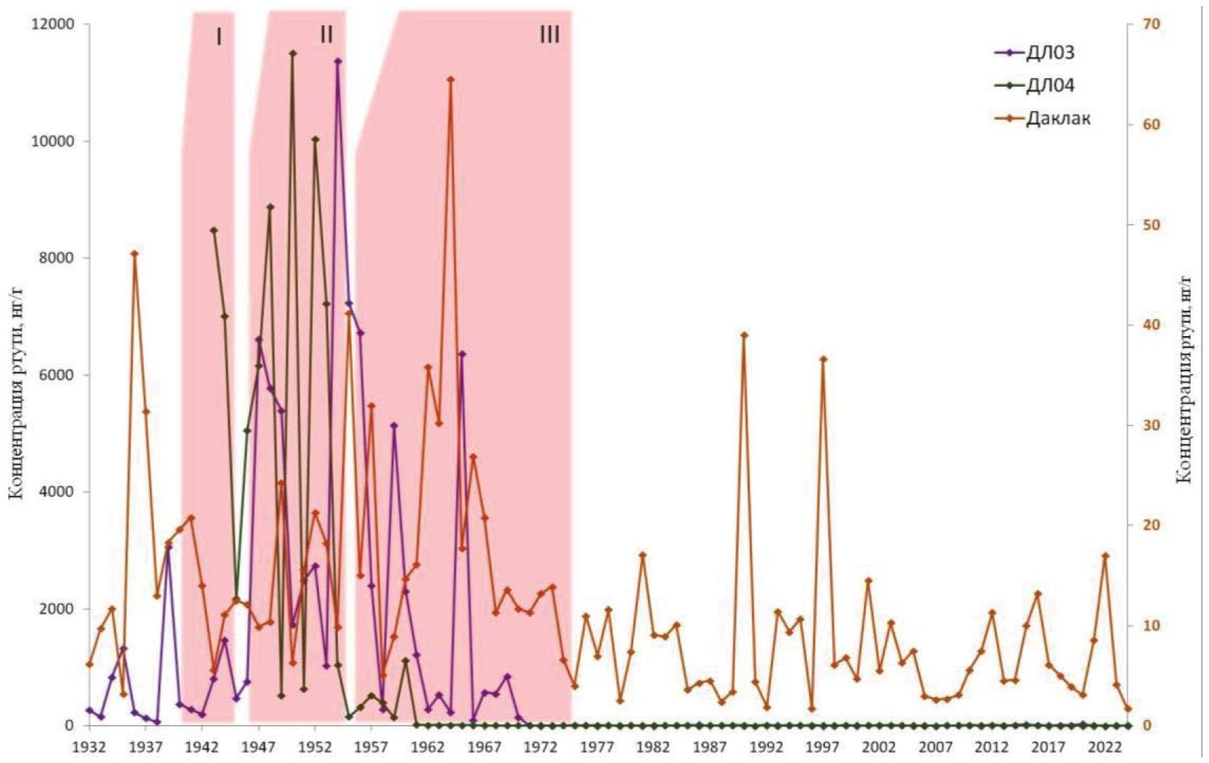 В рамках исследования был проведён анализ содержания ртути в кернах на рассматриваемых территориях за период с 1930 по 2023 гг. Продолжительность временного ряда варьировалась от 80 до 93-х лет. Для удобства предоставления полученных данных концентрации ртути приведены с усреднением за 10 лет: 1930–1939, 1940–1949, 1950–1959, 1960–1969, 1970–1979, 1980–1989, 1990–1999, 2000–2009, 2010–2019 и 2020–2023.