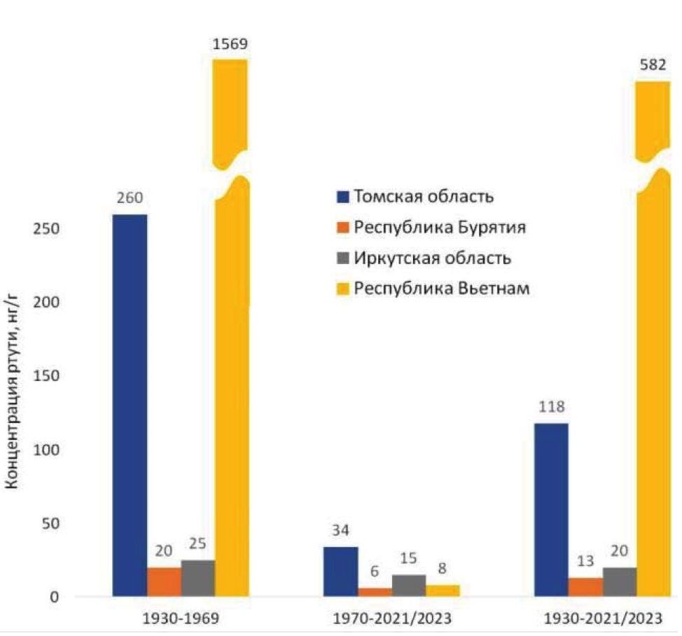 Максимальное значение отмечается в керне сосны Вьетнама (1569 нг/г), что превышает содержание в период 1970–2023 гг. (8 нг/г) в 193 раза, и среднее значение за весь исследуемый период (582 нг/г) – в 2,7 раза. Минимальное содержание ртути в интервале 1930–1969 гг. отмечено в Республике Бурятия и в Иркутской области (20 и 25 нг/г, соответственно), что по сравнению с данными после 1970 г. и за весь исследуемый период выше в 3,3 и 1,5 раза, а также в 1,7 и 1,3 раза, соответственно. В Томской области среднее содержание ртути 260 нг/г (1930–1969 гг.), что в 6 раз ниже, чем во Вьетнаме, и в 10 раз выше, чем в Иркутской области. Примечательно, что период с 1930 по 1969 гг. совпадает со значительным ростом научно-технического прогресса.