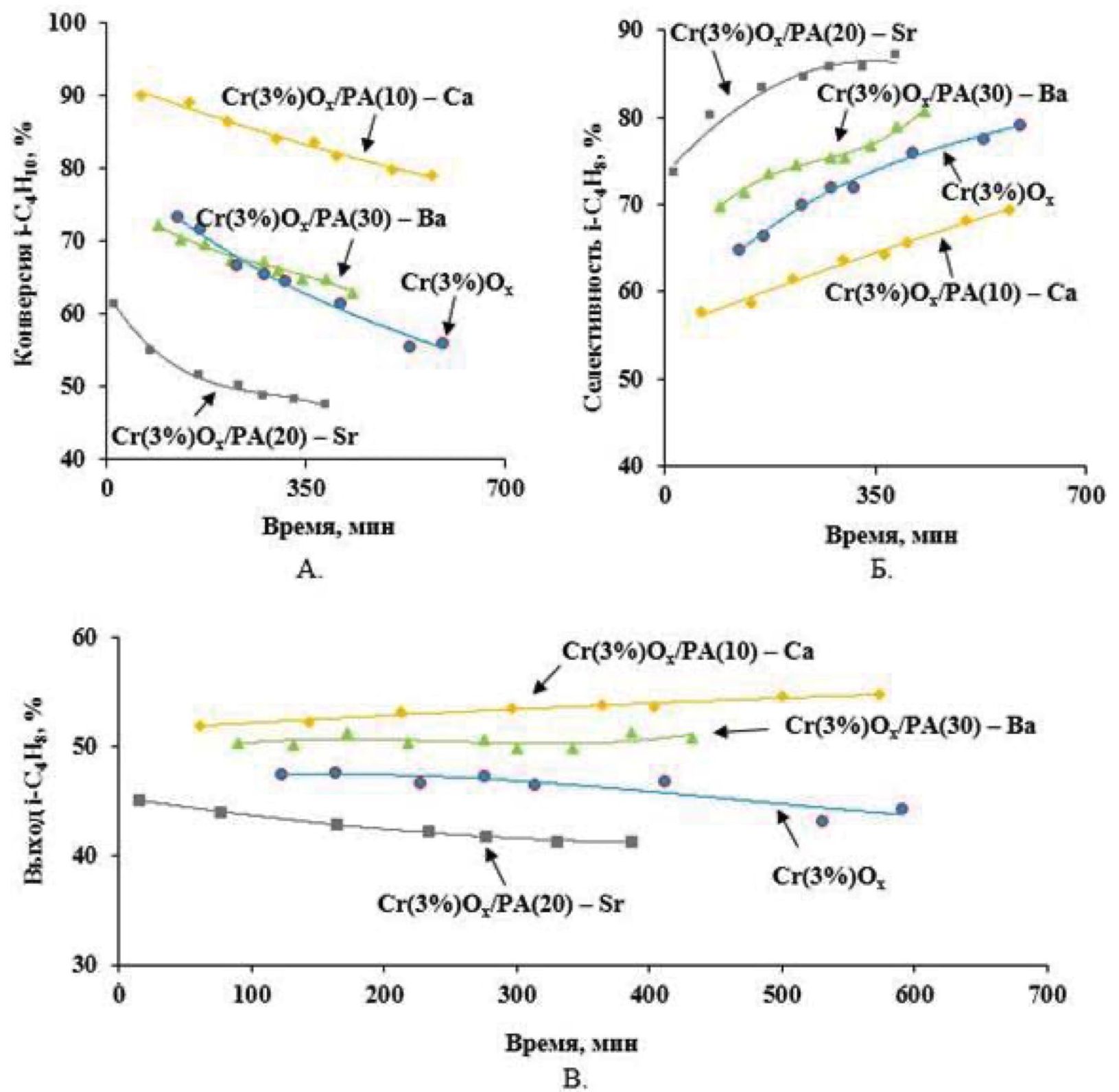 Относительно других образцов барий-промотированный катализатор демонстрирует высокую начальную активность, однако его селективность изначально низка. Селективность, впрочем, быстро растет в ходе эксперимента, и через 7 часов работы выход по целевому продукту становится сравним с лучшими образцами, каковыми являются катализаторы, содержащие кальций и стронций (выход по изобутену выше 50 % (рис. 3, В)).