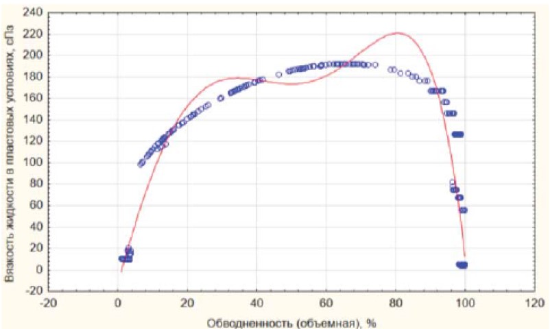 Рис. 1. Зависимость вязкости жидкости от обводненности (скорректированная выборка данных)