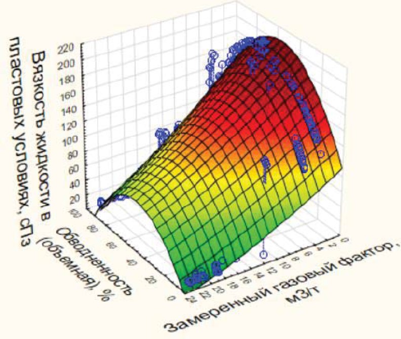 На основе полученного решения видно, что распределение значений выборки достаточно корректно описывается указанной функцией. С ростом газового фактора вязкость жидкости снижается, при этом учитывается единовременное влияние обводненности, в интервалах обводненности от 0 до 60 % вязкость жидкости растет, в интервалах от 60–70 до 100 % вязкость жидкости падает.