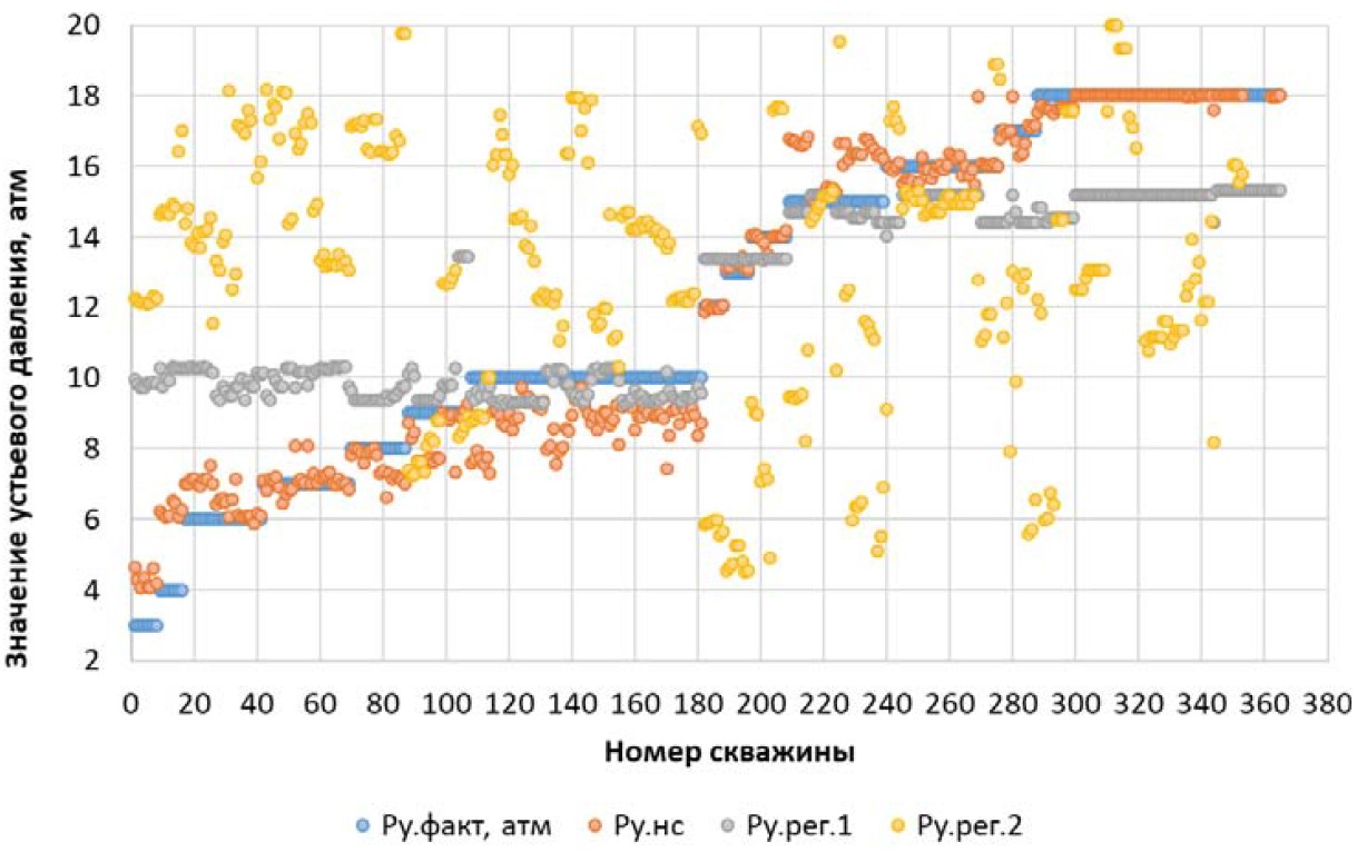 На основе полученных результатов видно, что расчетные значения по нейронной сети и регрессионному уравнению достоверно описывают фактические значения, однако второе регрессионное уравнение имеет большой разброс на всех интервалах значений устьевых давлений. Поэтому в дальнейшем при проведении расчетов исключается из применения уравнение до накопления выборки по параметрам, входящим в указанное уравнение.