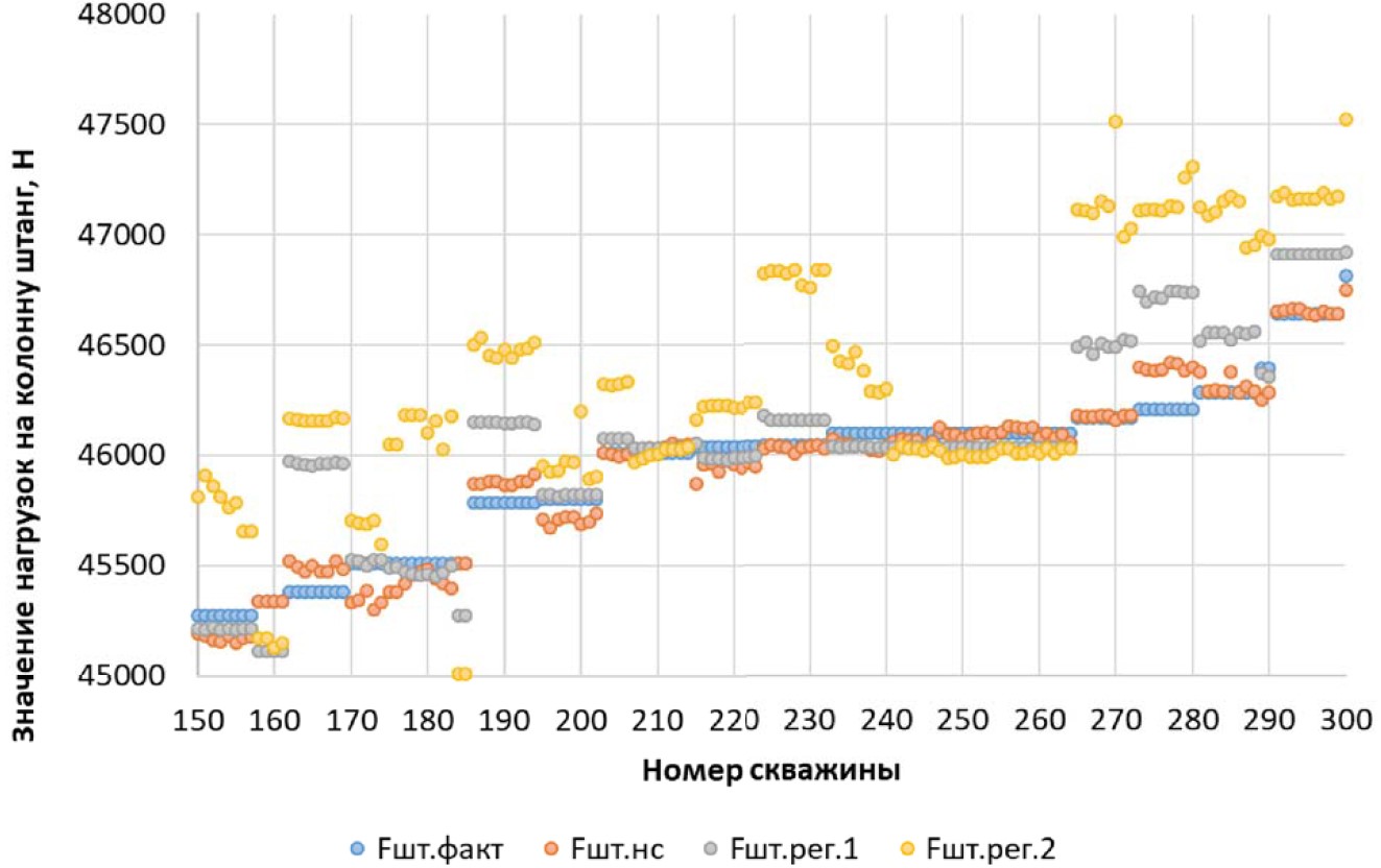На основе расчетных или прогнозируемых значений устьевого давления при ограниченных исходных данных можно определить нагрузку на колонну штанг с учетом влияния многих факторов – вязкости жидкости, газового фактора, подачи насоса, глубины спуска насоса и др., указанных раннее [16–18].