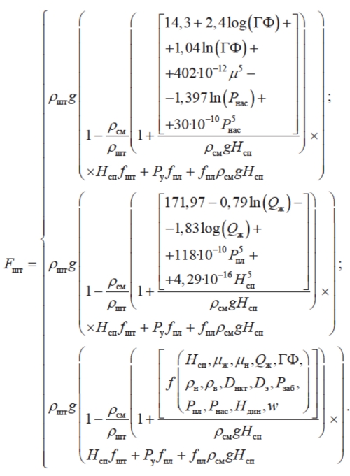 где Pсп – глубина установки насоса, м; µ – вязкость дегазированной нефти, мПа·с; Qж – теоретическая подача насоса, м3/сут; n – число качаний, мин–1; ГФ – газовый фактор, м3/м3; ρн – плотность нефти, кг/м3; ρв – плотность воды, кг/м3; Dикт – внешний диаметр НКТ, мм; Dэ – внутренний диаметр эксплуатационной колонны, мм; Pпл – пластовое давление, атм; Pнас – давление насыщения, атм; Pзаб – забойное давление, атм; Hдин – динамический уровень, м; w – обводненность, доли.