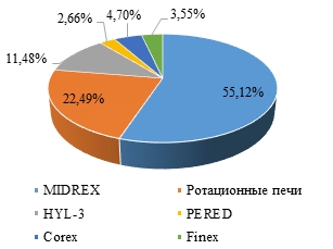 - В результате обзора литературы было установлено, что на данный момент ведущей технологией внедоменного восстановления железа является MIDREX, доля которой в структуре мирового производства внедоменного чугуна составляет 55,12 %, на втором месте расположился процесс, базирующийся на использовании ротационных печей, – 20,2 %, на третьем – HYL-3 с долей 11,48 %, на четвертом месте находится COREX – 4,70 %, на пятом – FINEX с долей 3,55 %, а наименее распространенной технологией является PERED с долей 2,66 %.