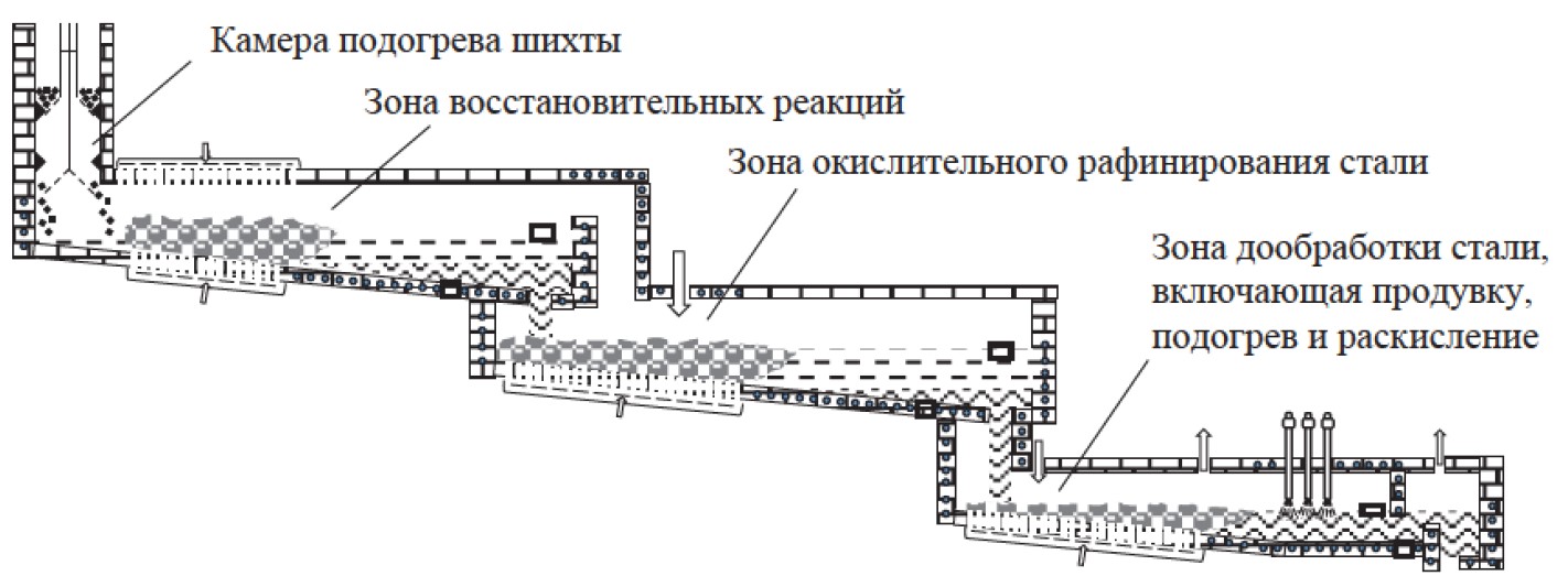 По каскаду последовательно расположенных и наклонённых желобов течёт железосодержащий расплав, подвергаемый последовательной обработке. В зонах обработки металла поддерживается барботирующий слой расплава, организуется и поддерживается гарнисаж ограждений. Поступающий через перфорированный под холодный газ нагревается, тем самым возвращая энергию обратно в процесс, снижая потери в окружающую среду через ограждение. Кроме этого, непрерывно ведётся комплексная доводка стали с применением продувки инертным газом, подачей раскислителей, шлакообразующих и легирующих элементов, электроподогревом и вакуумированием.