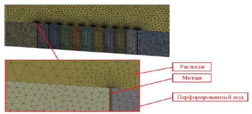 Relevance. The volume of steel production in Russia and in the world has doubled over the past 20 years, the cost of steel in Russia in the period from October 2018 to March 2020 increased from 45 to 105 thousand rubles. This determines the urgency of developing energy-efficient steel production technologies that will reduce the cost of production. The most common technology for the producing steel of the full metallurgical cycle involves iron reduction in blast furnaces and characterized by significant emissions of pollutants into the environment. One of the most promising areas of environmentally friendly and energy-efficient steel production is non-straw production. At the moment, there are about a hundred different iron recovery processes, some of them have been brought to industrial use. Aim. To develop a fuel supply system in a perforated hearth, eliminating heat losses in the steelmaking unit by organizing a perforated hearth, which allows heat to be returned to the working space of the furnace by heating the reducing agent. Methods. Numerical modeling by Volume of Fluid (VOF) and Euler-Euler (EE) methods. Results. The authors have determined the rate of supply of reducing gas, which ensures its conversion to carbon and hydrogen at the entrance to the working area of the furnace. It was found that the surface temperature of the perforated hearth on the gas side is 380°C, on the melt side does not exceed 1313°C, which is significantly lower than the melting point of the refractory material.