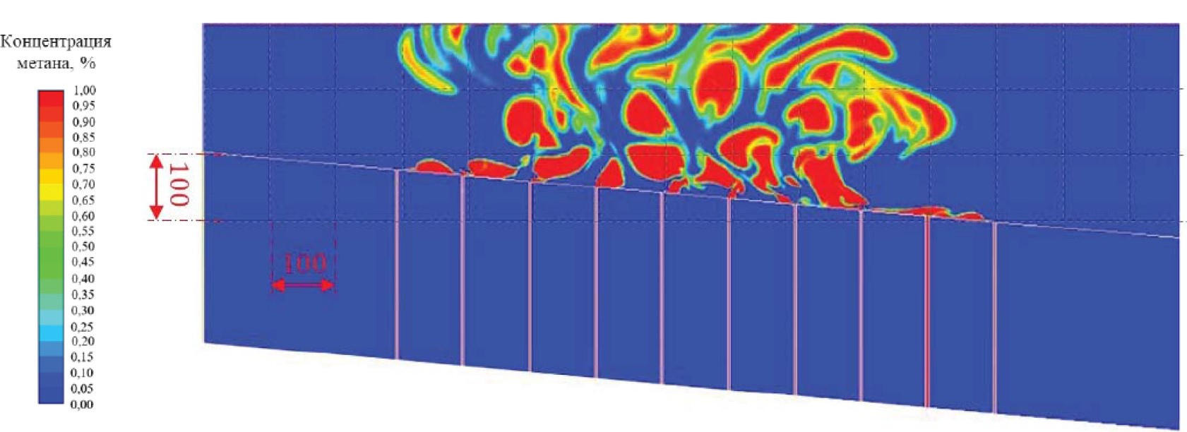 Рис. 8. 2D-модель барботажа при скорости метана на входе 5 м/с