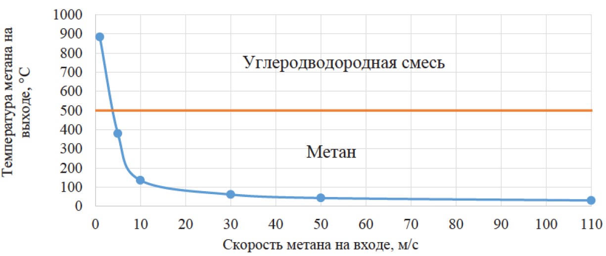 В табл. 5 представлена температура газа на выходе из каналов (нумерация слева направо от 1 до 10), а на рис. 10 – зависимость средней температуры газа на выходе из канала от скорости его подачи в перфорированный под. Горизонтальной линией указана температура в 500 °С, при которой начинается интенсивное разложение метана на углерод и водород [28]. Нагрев природного газа выше этой температуры приведёт к зарастанию каналов сажевыми частицами.