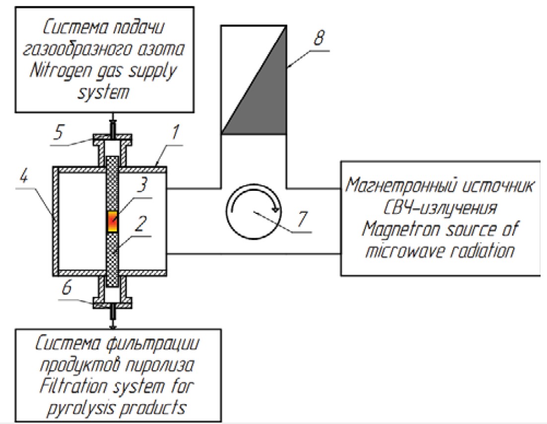 Эксперименты проведены на лабораторном комплексе для СВЧ-переработки органических материалов, принципиальная схема которого представлена на рис. 1. Подробно методика подготовки образцов и проведения эксперимента на данном лабораторном комплексе описана в работе [29]. Принципиально эксперимент состоял в следующем. Предварительно из каждого вида рассматриваемого сырья изготавливали образец – 3 в виде гранулы (диаметр 12 мм, масса 3,0 г с допустимым отклонением ±0,1 г). Образец располагали по центру кварцевой трубки – 2 реакционной камеры – 1, после чего при помощи системы подачи азота, состоящей из баллона, редуктора и ротаметра (на рисунке не показаны), осуществляли продувку азотом всего объема лабораторного комплекса в течение не менее 5 минут. Необходимо отметить, что продувка азотом осуществлялась на протяжении всего эксперимента (расход 0,5 л/мин.) с целью создания избыточного давления в системе. При помощи магнетронного источника (мощность 800 Вт) генерировали СВЧ-излучение с частотой 2,45 ГГц, которое через циркулятор – 7 поступало в реакционную камеру – 1, где часть излучения поглощалась образцом. Не поглощенное образцом излучение перенаправлялось с помощью циркулятора – 7 в теплообменник – 8, где трансформировалось в теплоту и выводилось из системы.