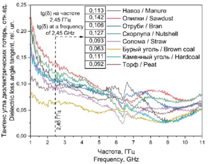 Величина мощности, поглощаемой материалом и преобразуемой в теплоту, характеризуется тангенсом угла диэлектрических потерь [31]: с ростом данной величины увеличивается скорость нагрева образца. Таким образом используемая частота СВЧ-излучения должна обеспечивать высокое значение тангенса для всех исследуемых материалов, что позволит организовать максимальную эффективность термической переработки. Из рис. 2 видно, что тангенс угла диэлектрических потерь на различных частотах излучения меняется, при этом наибольшие его значения отмечены в диапазоне от 1 до 5 ГГц. Учитывая, что Федеральная комиссия по связи (Federal Communications Commission – FCC) в рассматриваемом частотном диапазоне зарезервировала 2,45 ГГц для использования в промышленных, научных и медицинских целях [22], СВЧ-переработка рассматриваемых материалов будет осуществляться при данном значении частоты магнетрона.